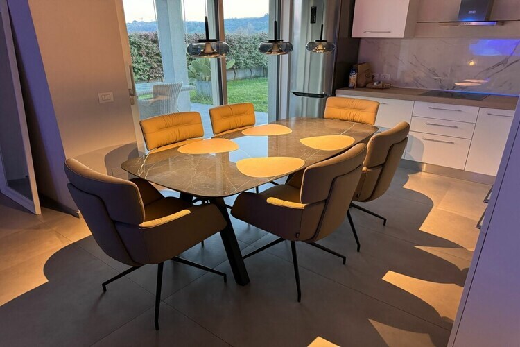 La partie principale de la villa, d'une surface habitable d'environ 160 m², est de plain-pied. Elle est construite comme un bungalow, avec une tour. Un escalier ouvert en marbre avec éclairage LED mène à la suite parentale à l'étage, d'environ 25 m², avec salle de bains privative et une superbe terrasse. La pièce de vie offre plusieurs accès au jardin et à la piscine. Par exemple, depuis la cuisine moderne équipée d'une table à manger en marbre et de chaises pivotantes en cuir, une grande baie vitrée coulissante donne sur la terrasse exposée plein sud, meublée de mobilier de jardin haut de gamme, et sur la piscine.