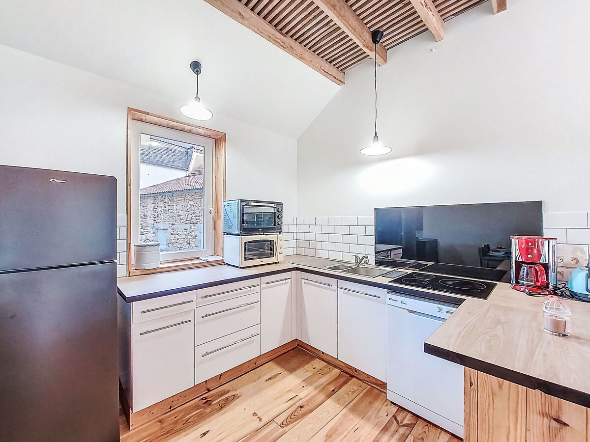 Cuisine ouverte (mini-four, four, lave-vaisselle, 3 plaques à induction, grille-pain, bouilloire électrique, micro-ondes, cafetière électrique).