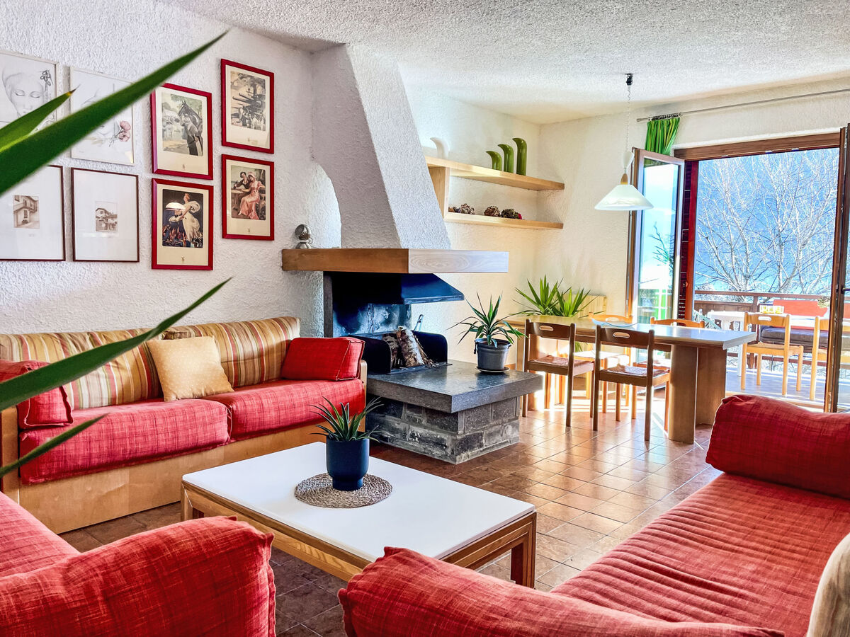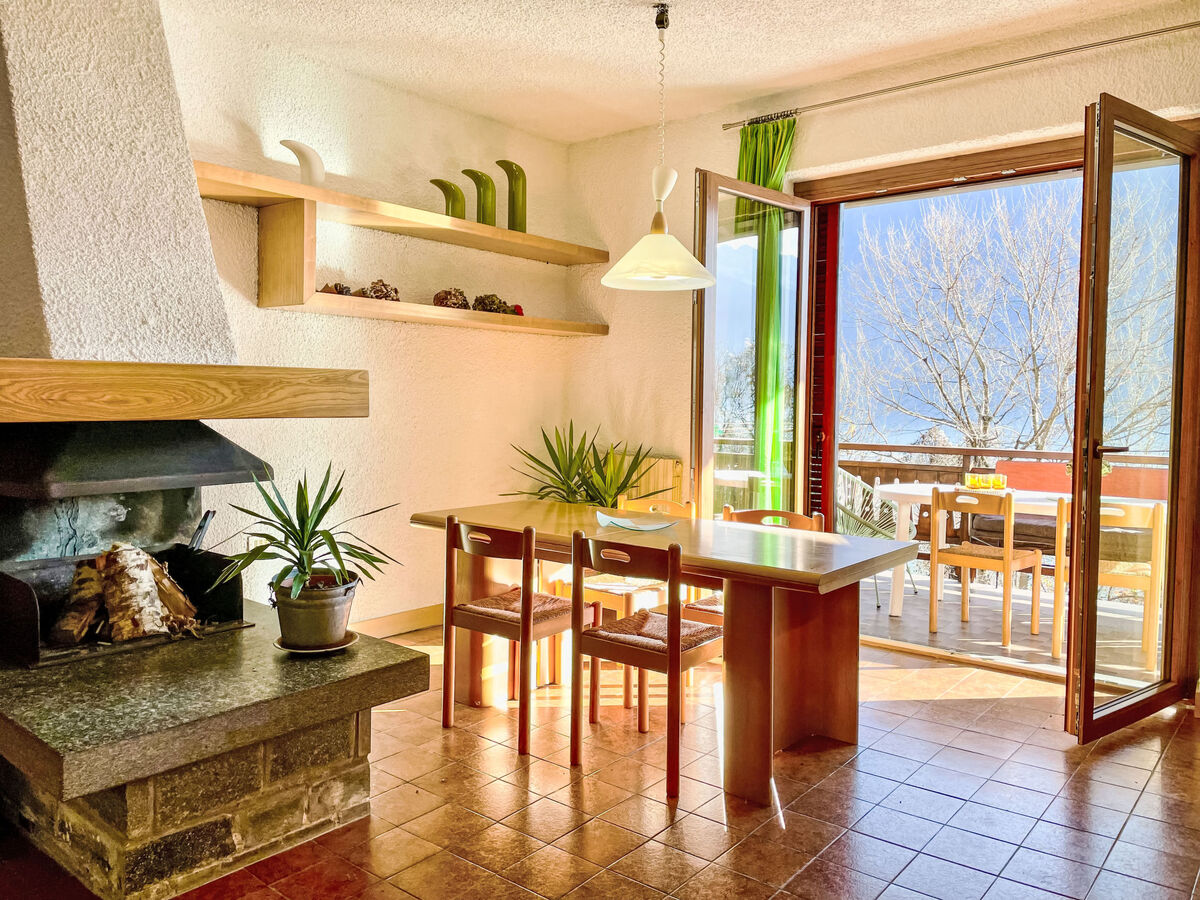 Aménagement confortable: grand séjour/salle à manger avec cheminée, table pour les repas et TV.