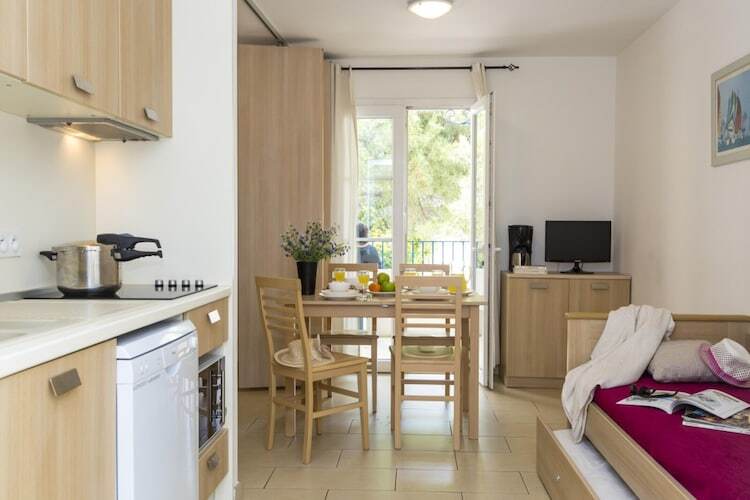 coin cuisine(bouilloire, grille-pain, cafetière/percolateur(filtre, pads), micro ondes, lave-vaisselle ), salle à manger-salon(canapé-lit double, TV, table), chambre(lit double), salle de bains(douche, lavabo, WC), garage, climatisation, piscine(partagé avec d'autres clients), ascenseur