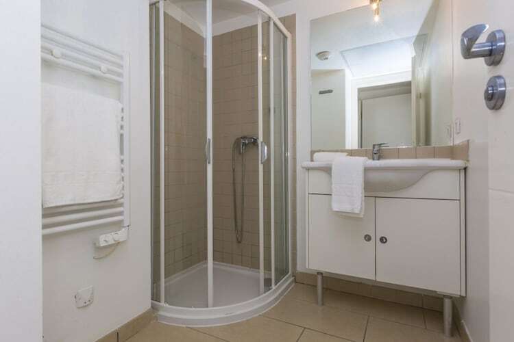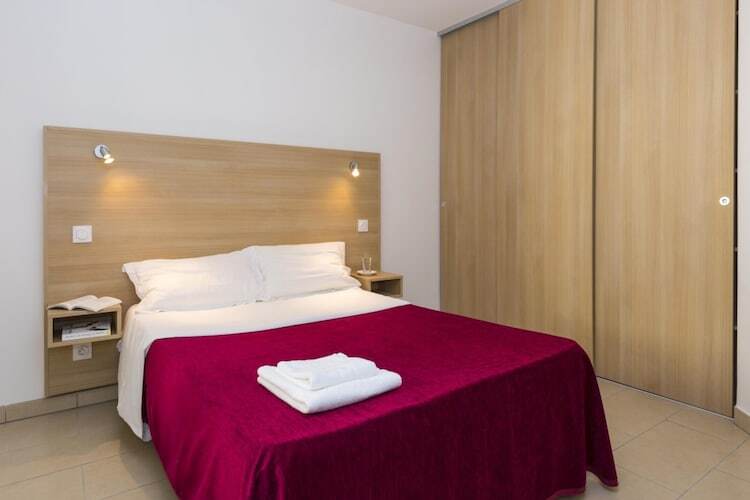 coin cuisine(bouilloire, grille-pain, cafetière/percolateur(filtre, pads), micro ondes, lave-vaisselle ), salle à manger-salon(canapé-lit double, TV, table), chambre(lit double), chambre(lit double), salle de bains(douche, lavabo, WC), garage, climatisation, piscine(partagé avec d'autres clients), ascenseur