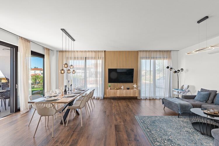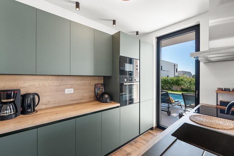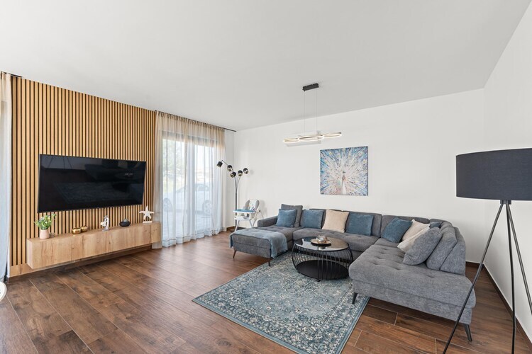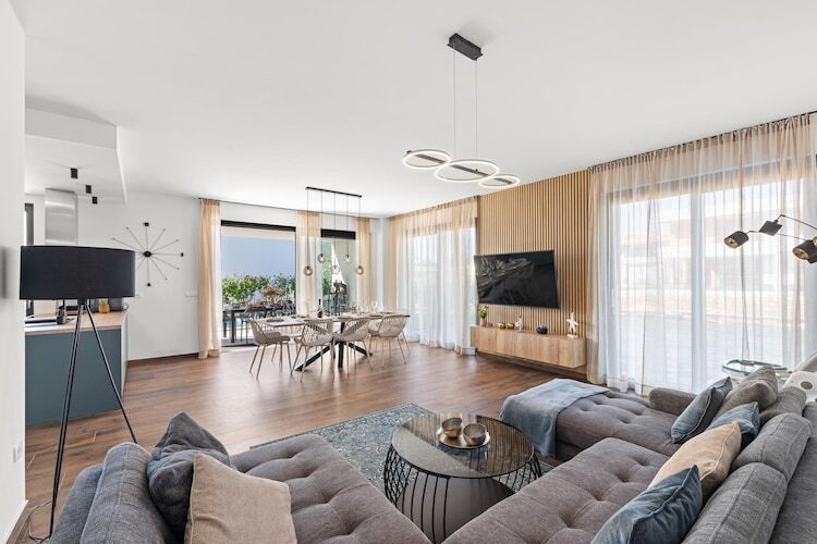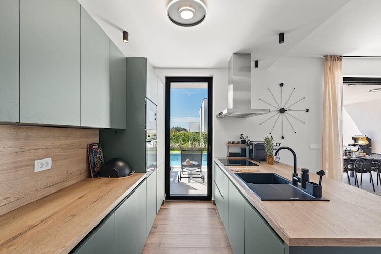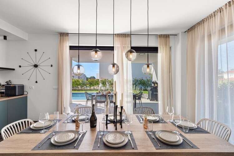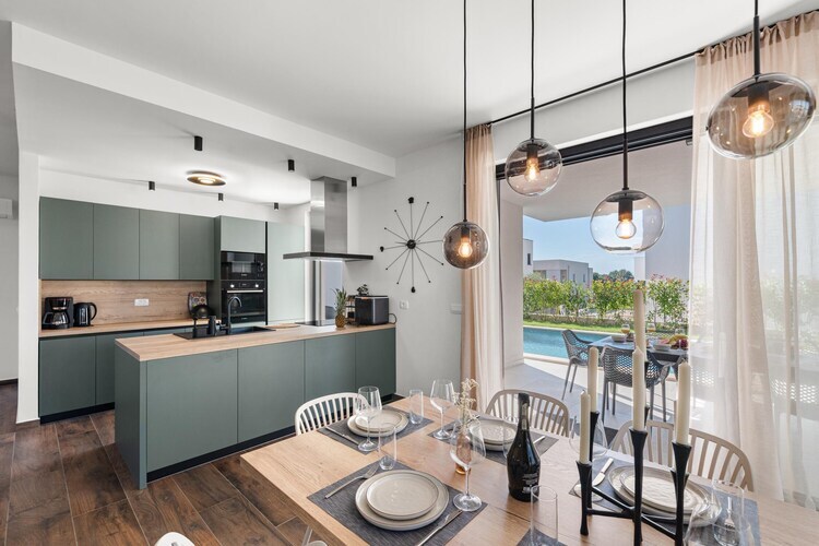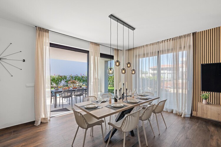 Cette villa d'exception offre un confort et une intimité absolus, idéale pour une grande famille ou un groupe d'amis. Le rez-de-chaussée comprend une cuisine américaine lumineuse et entièrement équipée d'appareils modernes, dont un four, un micro-ondes, un lave-vaisselle et un grand réfrigérateur-congélateur, ainsi que tous les ustensiles de cuisine essentiels. Cet espace s'ouvre sur un vaste séjour/salle à manger meublé d'une table et d'un coin salon confortable, avec télévision par satellite. Pour plus de commodité, le rez-de-chaussée abrite également la première chambre double avec salle de bains privative (douche, lavabo, WC).