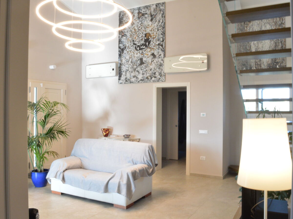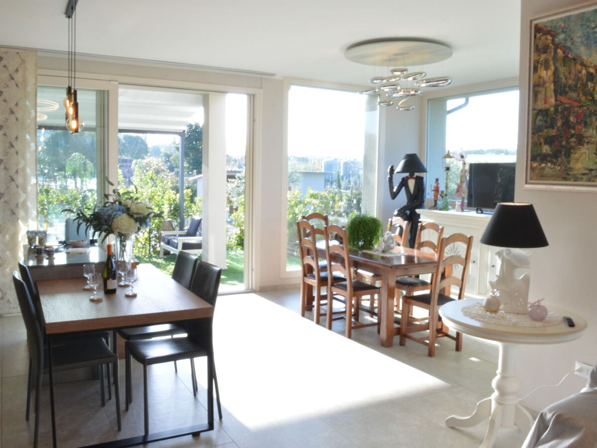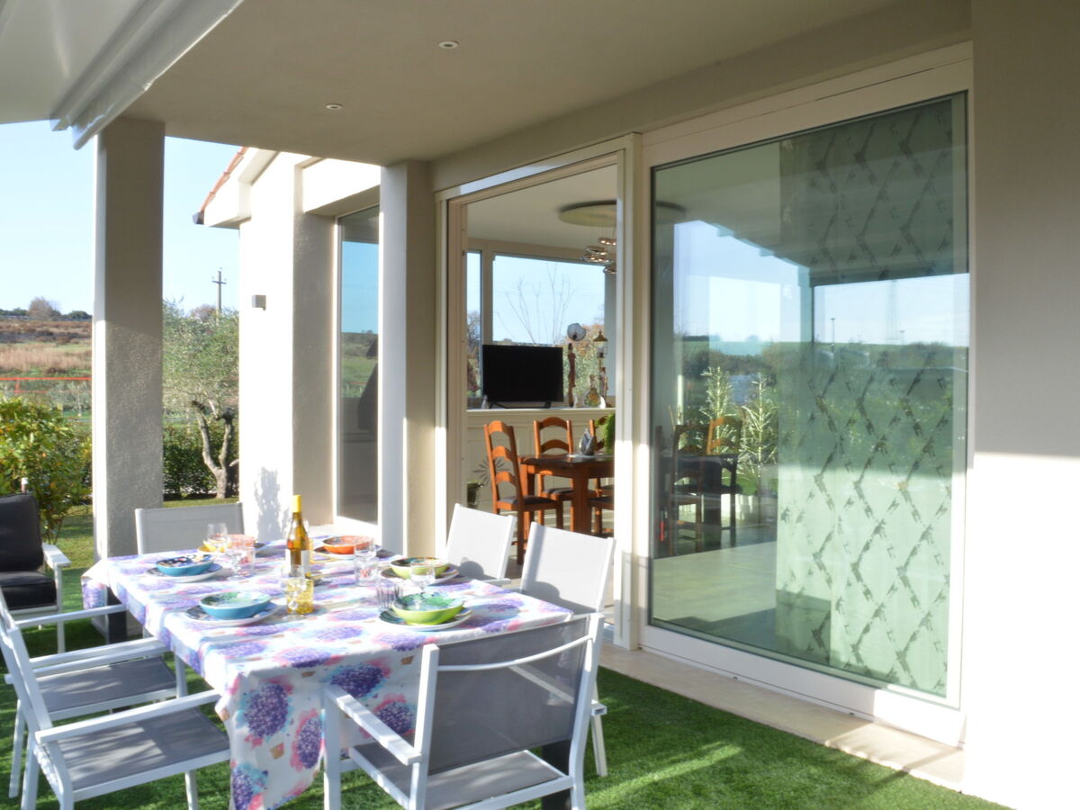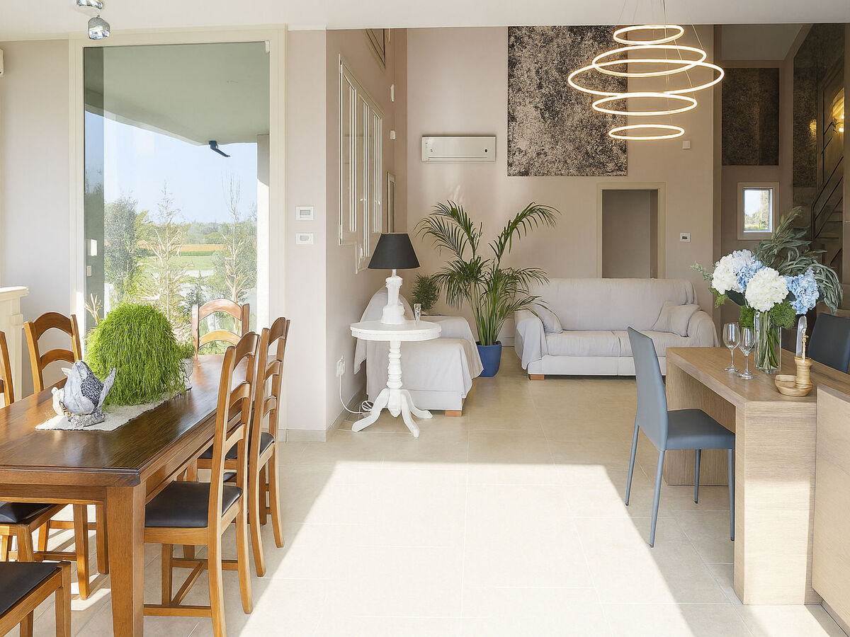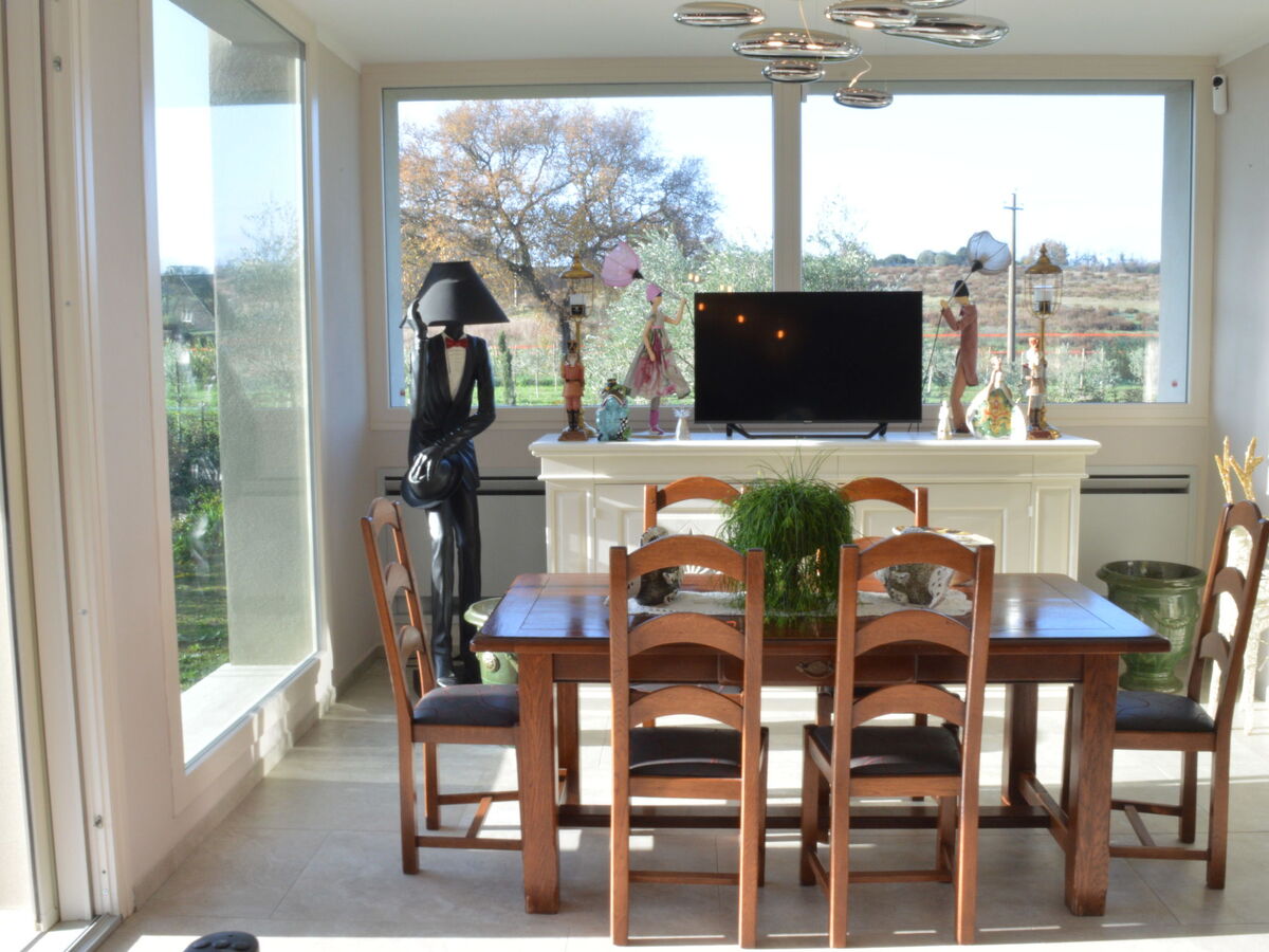 Aménagement moderne et de style: séjour/salle à manger avec baie vitrée avec table pour les repas, TV et air-conditionné.