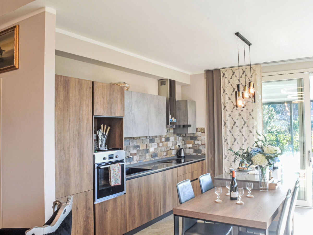 Cuisine ouverte (four, lave-vaisselle, 4 plaques à induction, grille-pain, micro-ondes, cafetière électrique).