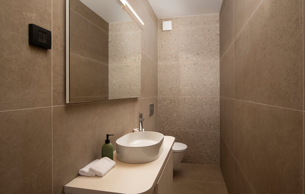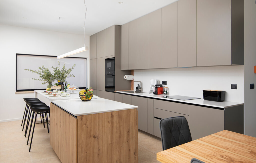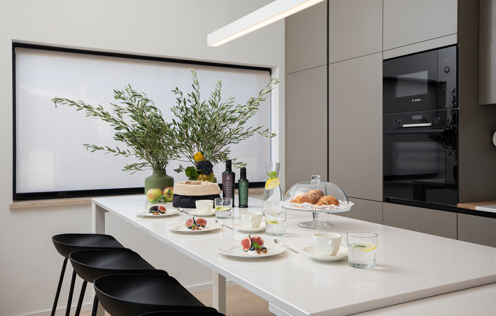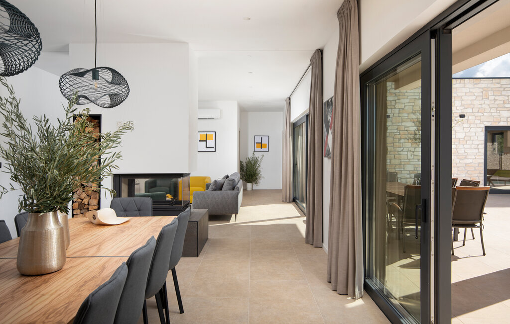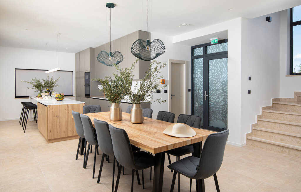 Entrez dans l'espace intérieur spacieux et profitez du design clair et élégant. Prenez place dans le salon élégant sur le canapé confortable et profitez de moments de détente avec un bon film. Utilisez la longue table à manger pour des repas en commun ou des soirées conviviales. Préparez vos repas dans la cuisine équipée de haute qualité avec îlot de cuisson, qui allie design moderne et fonctionnalité. Après des journées actives, retirez-vous dans le sauna pour vous détendre ou faites de l'exercice dans la salle de fitness.