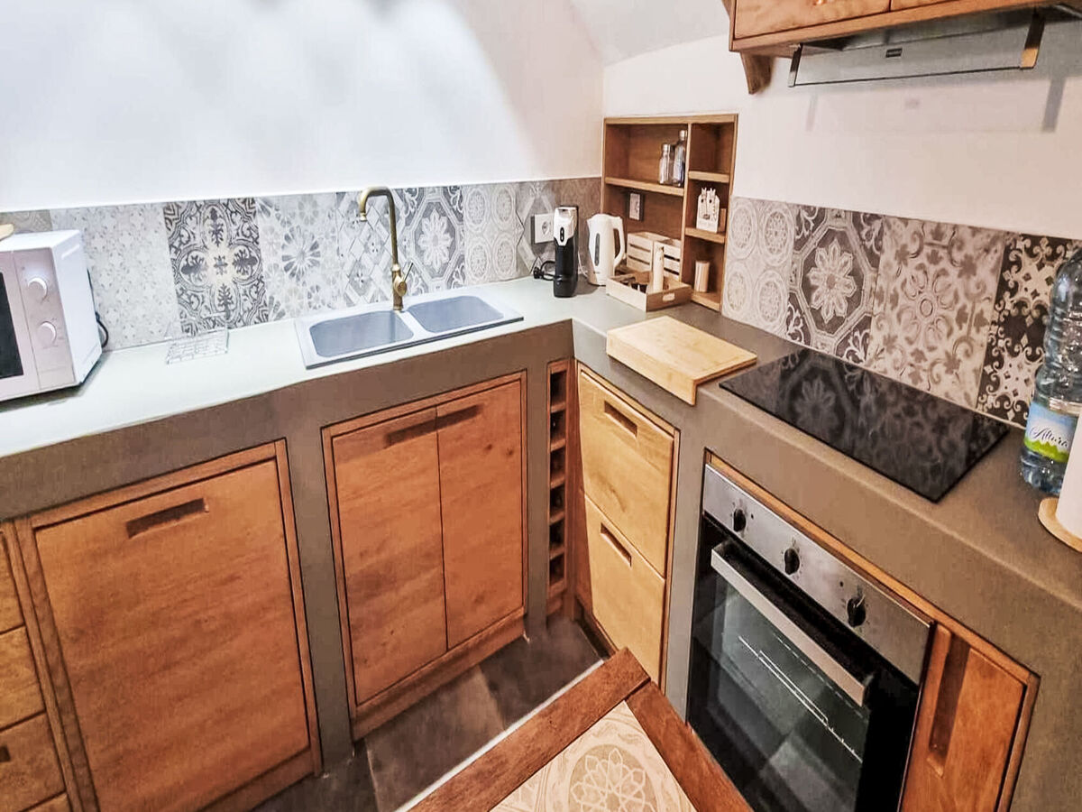 Cuisine ouverte (4 plaques de cuisson, four, lave-vaisselle, 4 plaques à induction, grille-pain, bouilloire électrique, cafetière électrique).