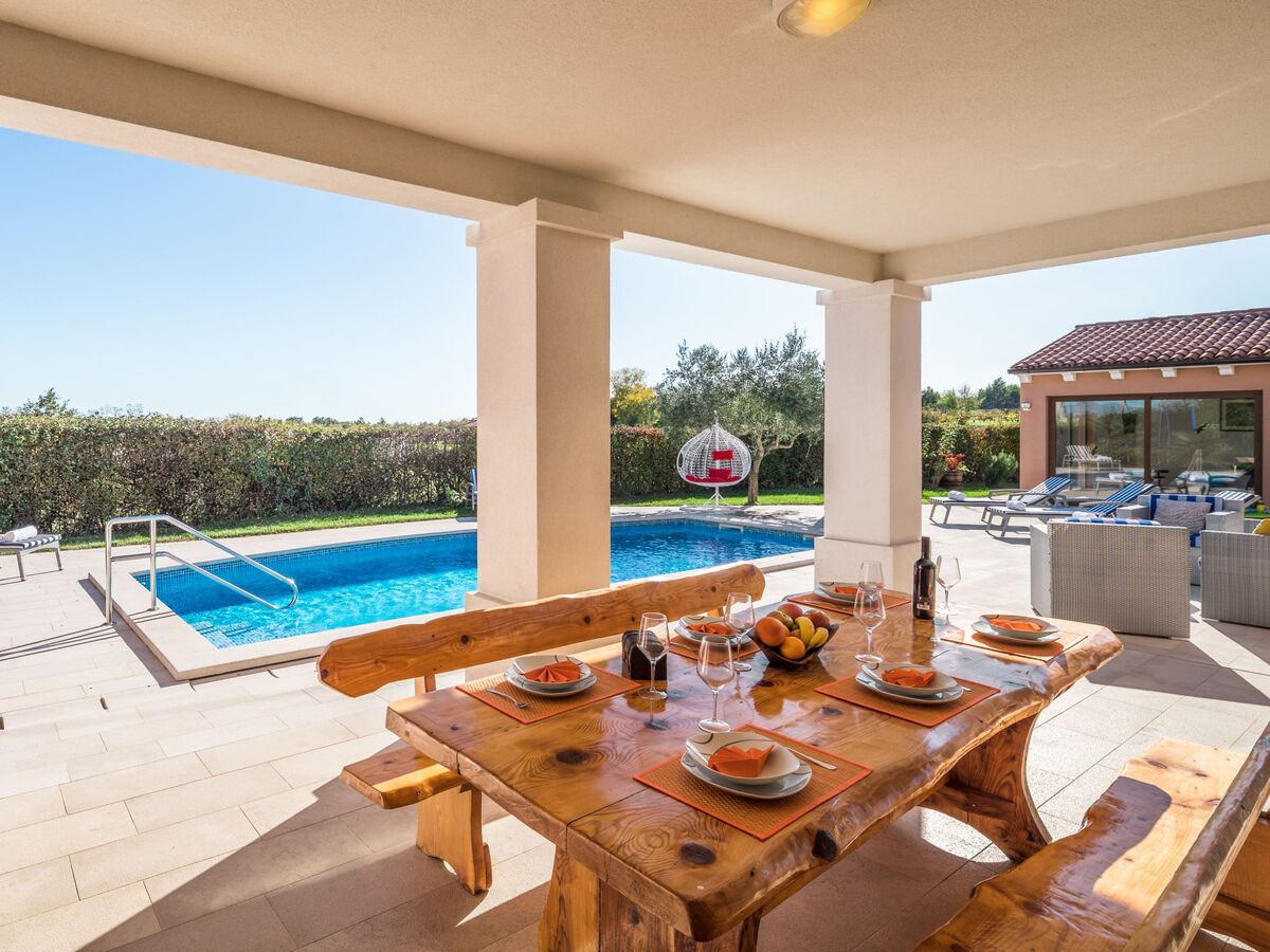 Villa is surrounded with 1000 m2 of green lawn, 50 m2 swimming pool (with massage function) and its stone beach with covered terrace and a big wooden table.