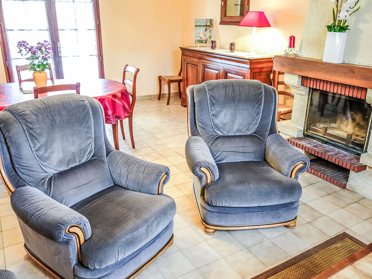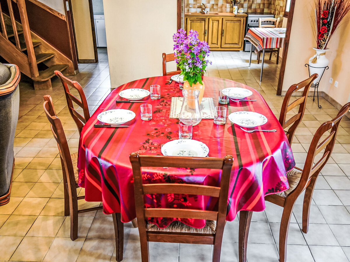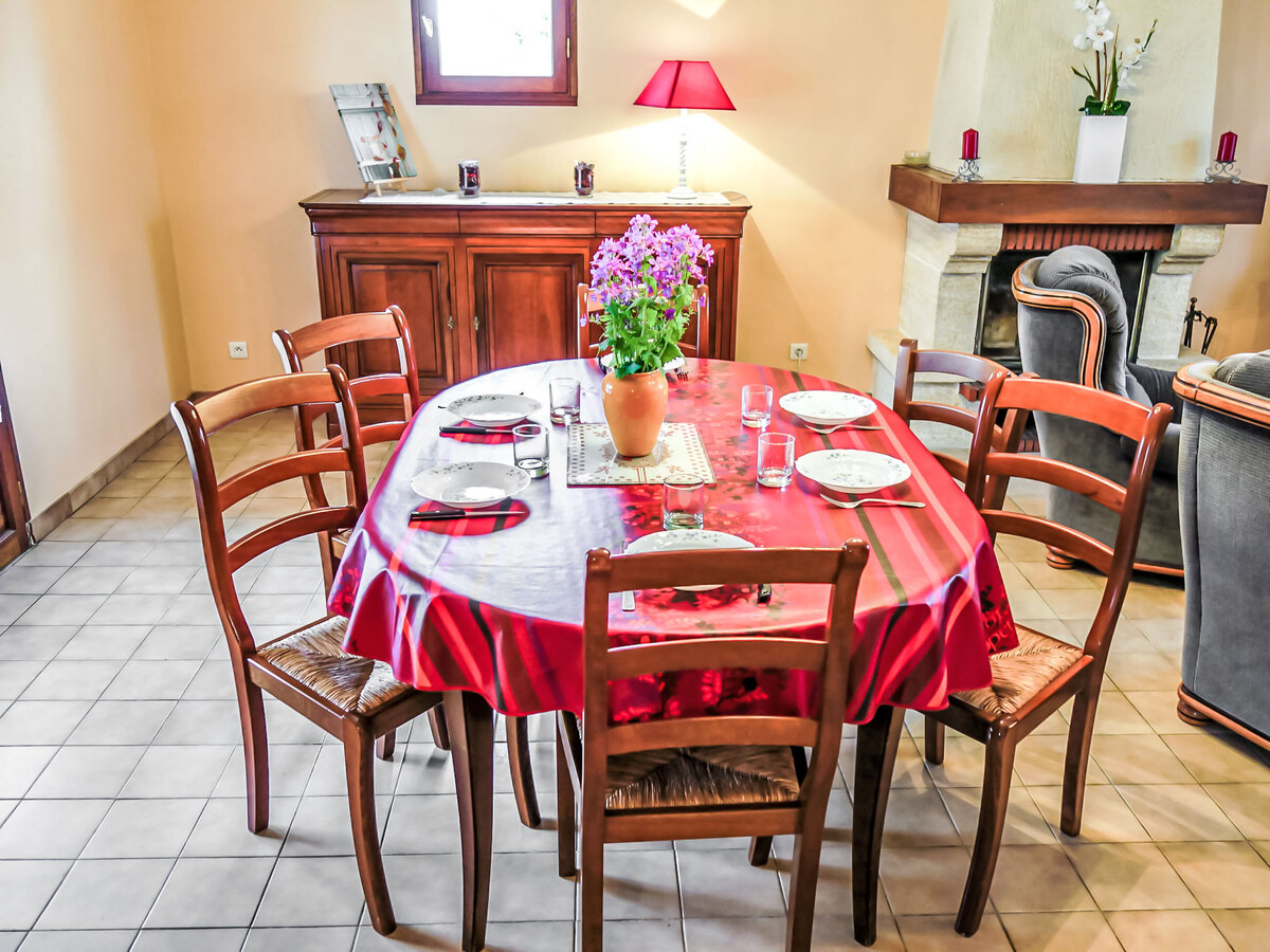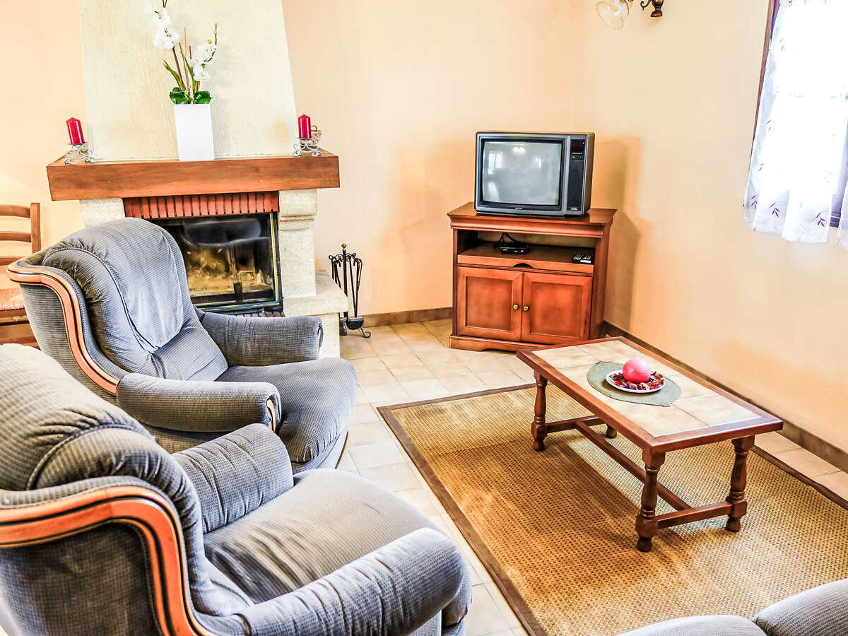 Aménagement agréable et rustique: séjour/salle à manger avec cheminée, table pour les repas et TV (écran plat).