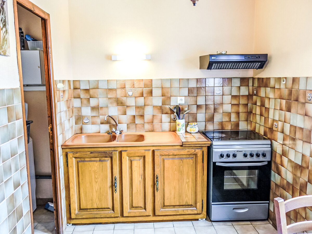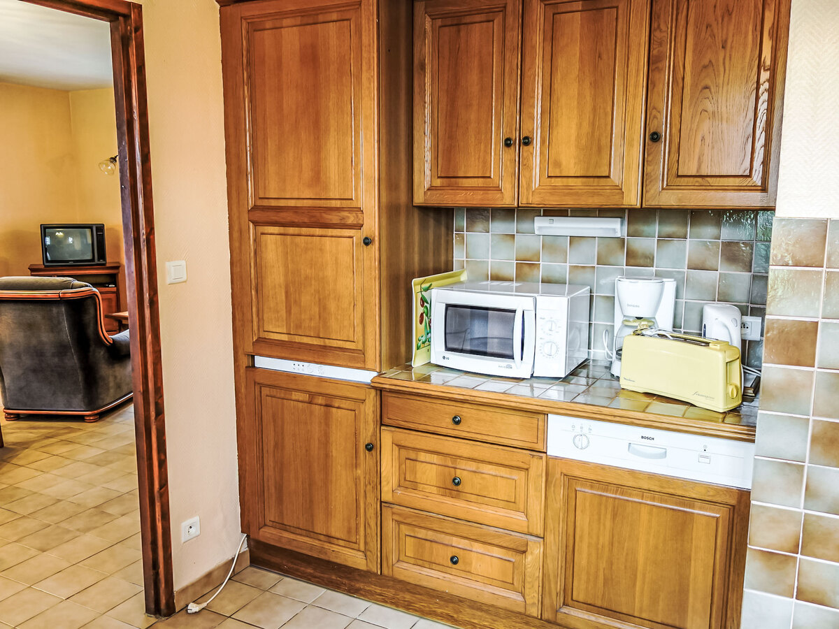 Cuisine ouverte (four, lave-vaisselle, 1 plaque vitrocéramiques, 3 feux, grille-pain, bouilloire électrique, micro-ondes, congélateur, cafetière électrique) avec petite table pour les repas.