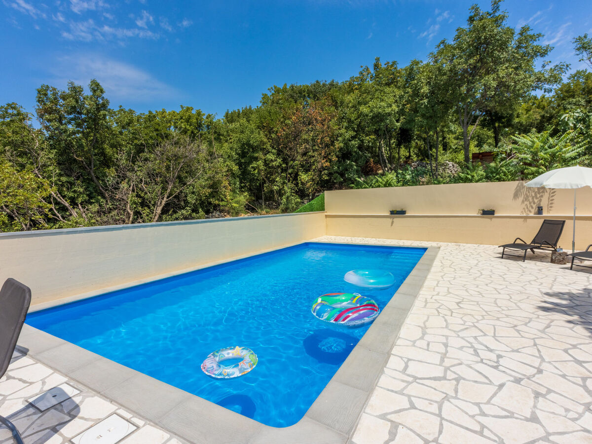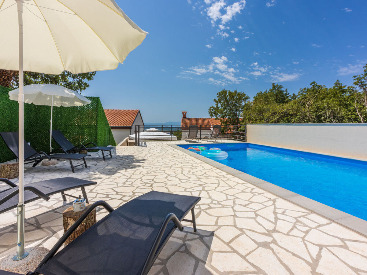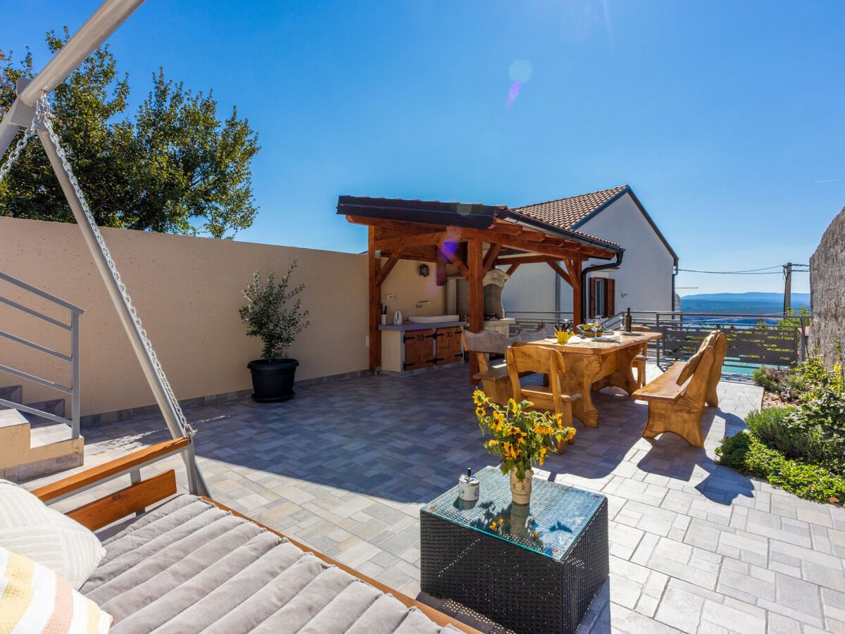 This is equipped with 8 sun loungers, a large table with seating for everyone, a gas grill, a sink, an outdoor shower, a toilet and an additional refrigerator.For the little guests of this house there is a play area with a trampoline.A small herb garden can be used by cooking lovers.In the pleasant surroundings of the house there are beautiful hiking trails that lead to the numerous peaks in this area.Living area: Living / dining room and kitchen are one room Sofa bed for two people terrace Sea view Tiles radio Satellite TVKitchen: kitchen dishes Kitchen towels Electric stove Hotplates: 4 Oven Fridge with freezer compartment Filter coffee machine water heater microwave Toaster dishwasherBedroom: Double room with double bed, balcony, sea view, tiles Double room with double bed, cot, 1 extra bed, sea view, tiles Room with bunk bed, balcony, sea view, tilesBathroom: Bathroom with toilet, shower Bathroom with toilet, shower separate toiletBalcony & terrace: own balcony Sea view Seating Balcony size: 8 m² own terrace partially covered Sea view Seating Terrace size: 24 m²Additional Information:Garden for use, gas grill available, parking on the property, swimming pool available, swimming pool size: 32 m², children's pool available, outdoor shower, pets allowed, daily fee for pets: per day: 5.00 €, heating available, daily heating fee: 5.00 € , Air conditioning included in the price, bed linen available, towels available, hairdryer available, washing machine available in the house, Internet via W-LAN, safe available, bicycles available on request.