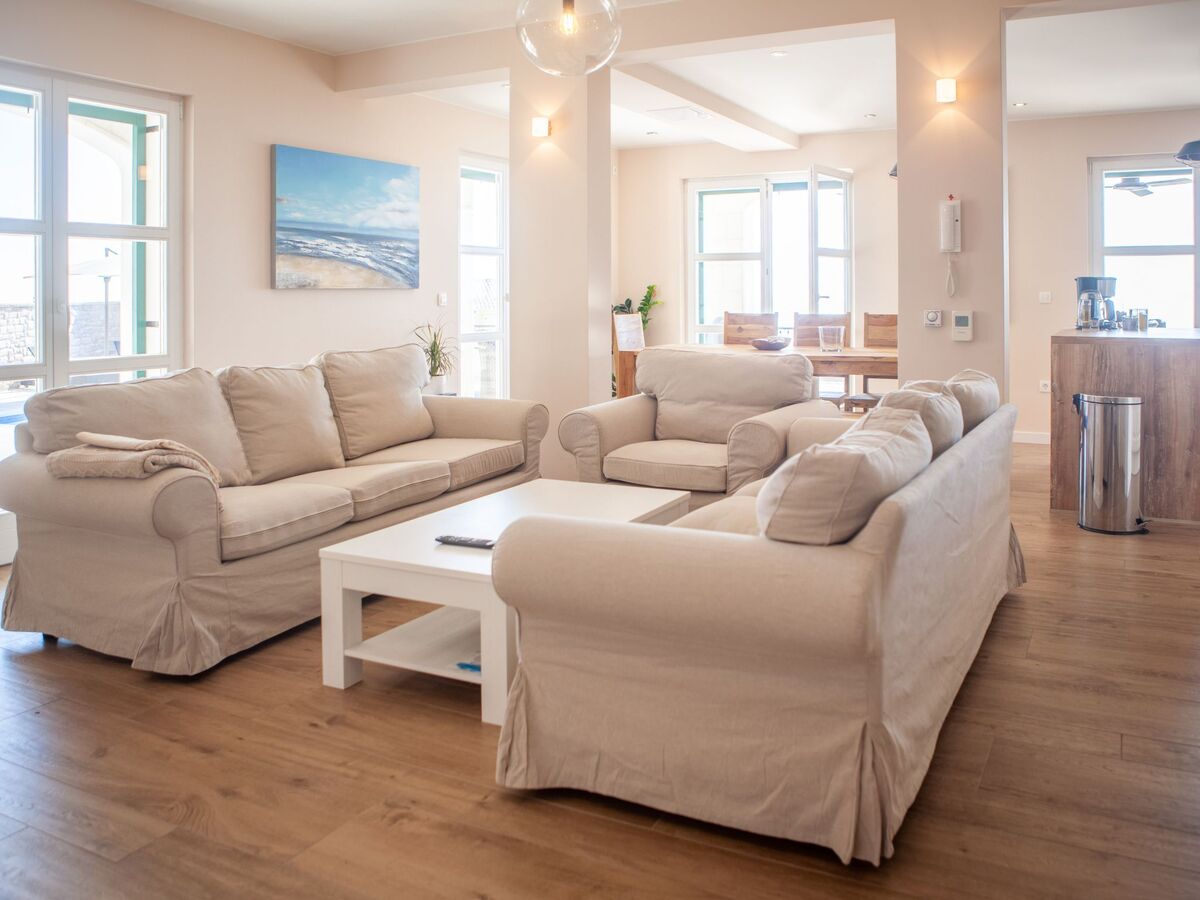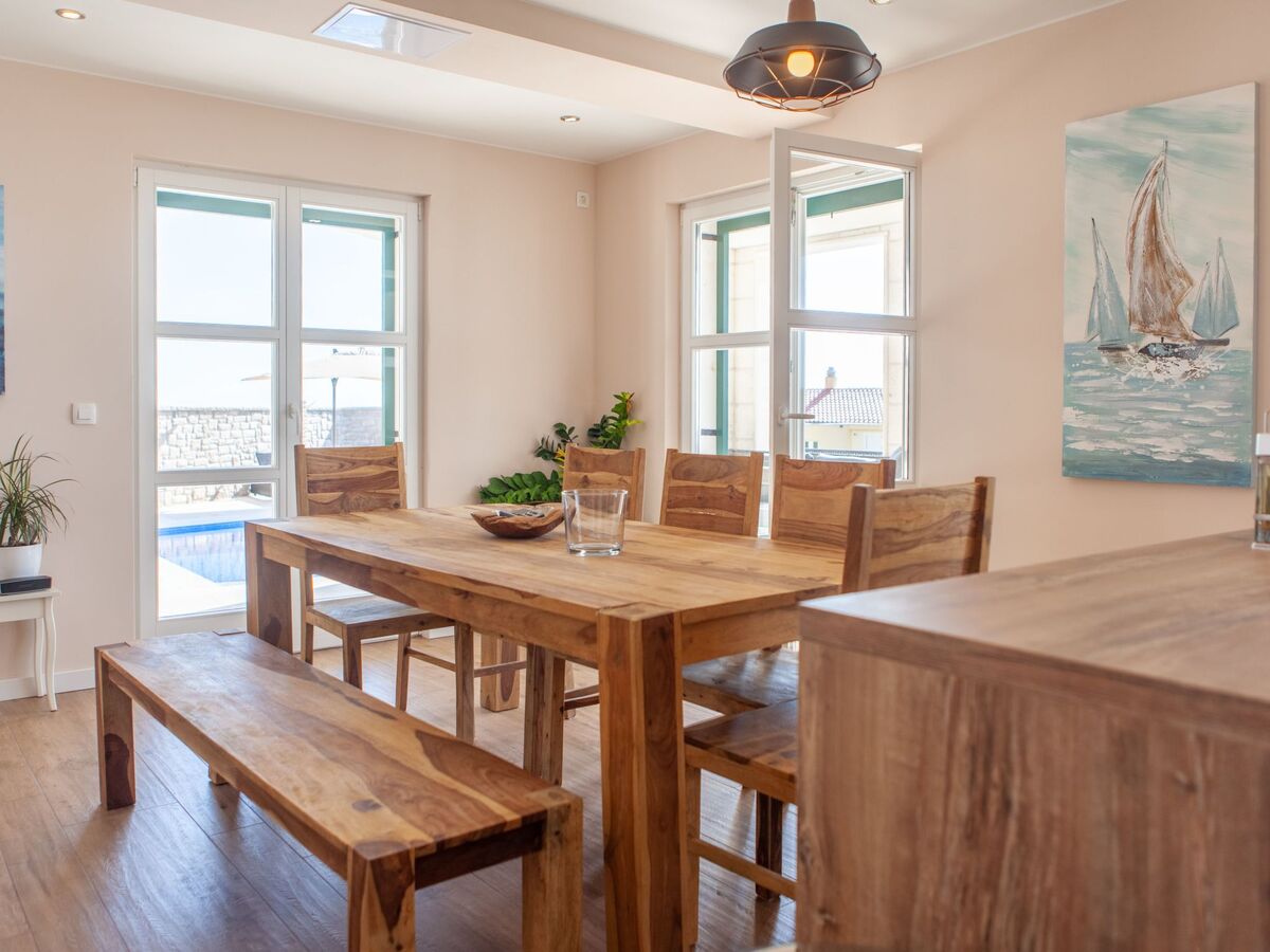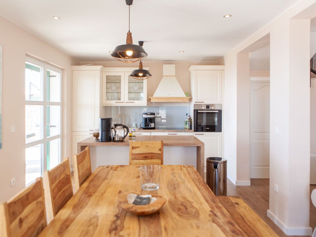 The ground floor consists of a spacious living room with an open kitchen and a dining table for up to 10 people.