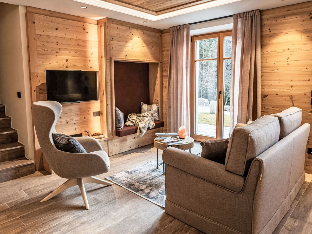 Spacieux et clair, aménagement moderne et avec beaucoup de bois: séjour avec cheminée et TV (satellite) (écran plat).