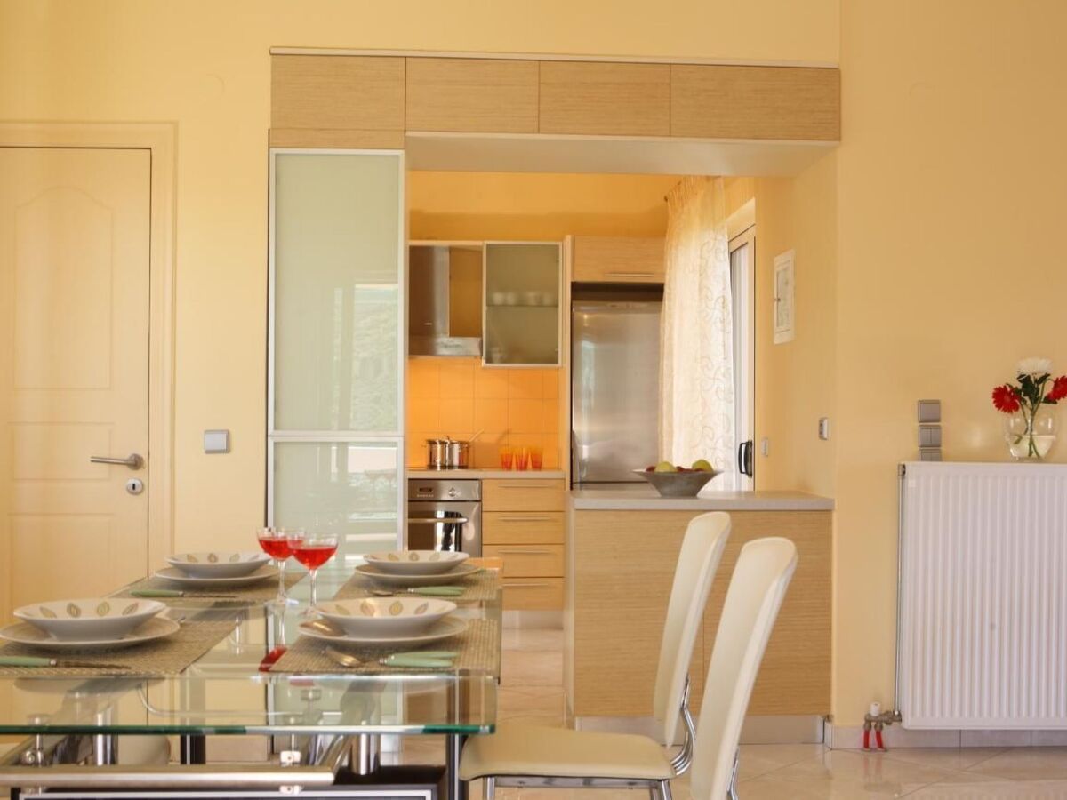 The kitchen is equipped with standard appliances such as a cooker, oven and refrigerator with freezer.