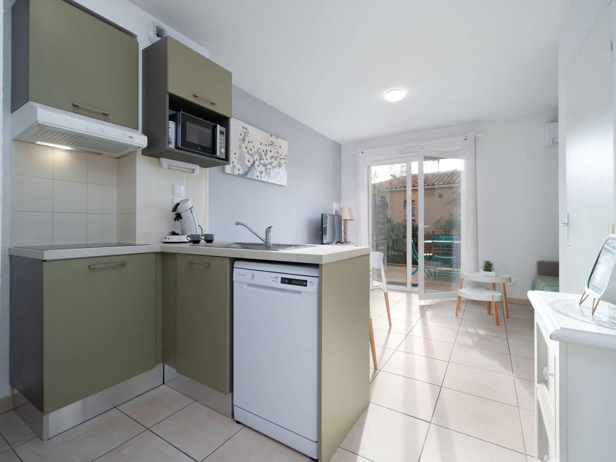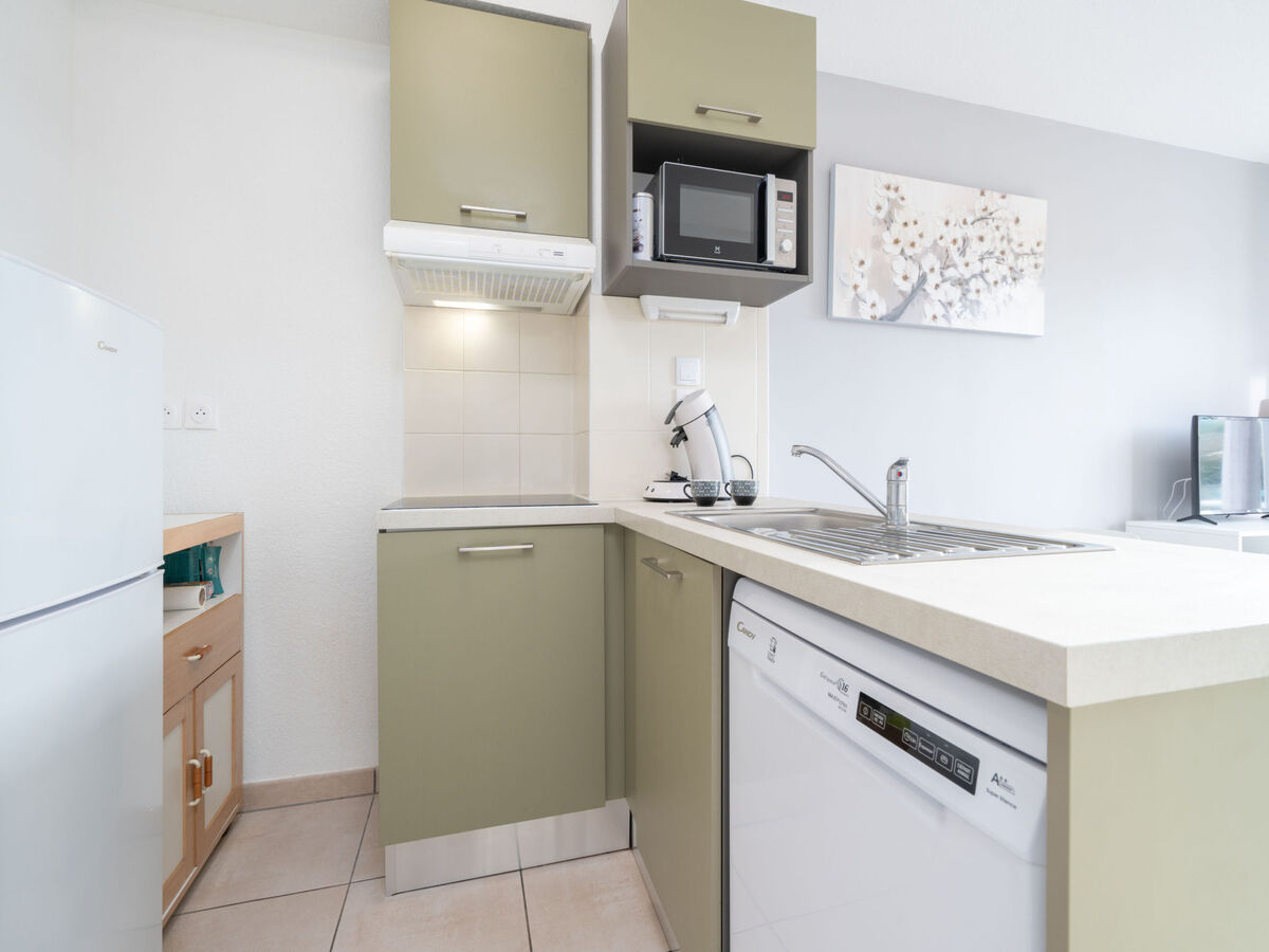 Cuisine ouverte (4 plaques de cuisson, lave-vaisselle, grille-pain, bouilloire électrique, micro-ondes, cafetière électrique).
