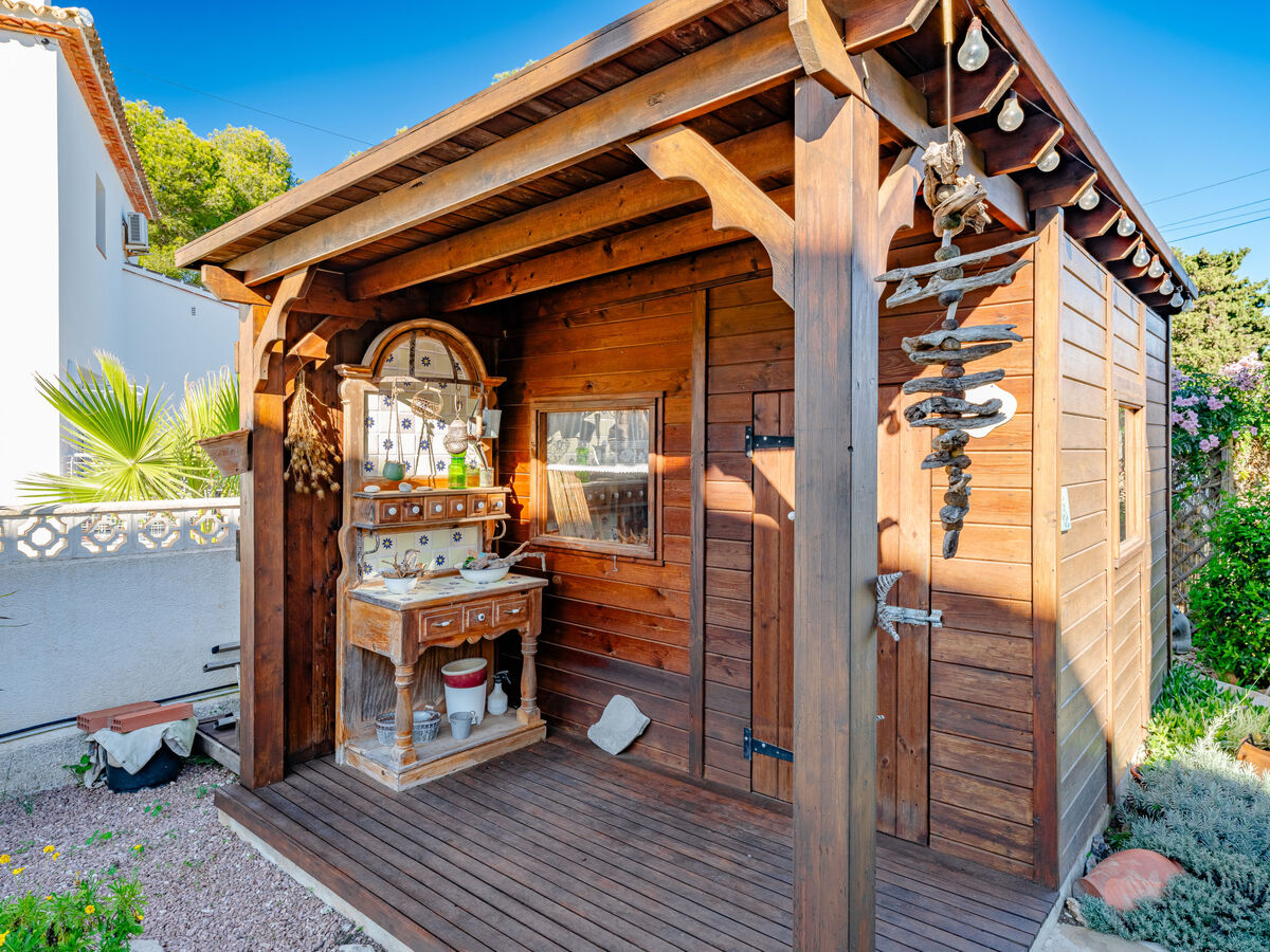 Douche extérieure, meubles de jardin, barbecue, place de parking sur le terrain.