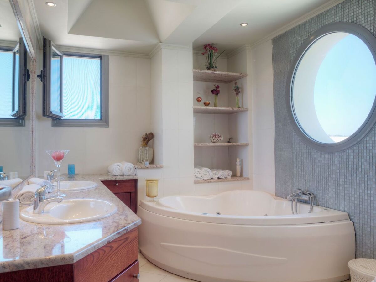 The front door opens on to a living room with a cozy fire place, satelite plasma TV, dvd player, four large leather sofas with cushions, a 12 seat dining area, an open plan living room with access to all the terraces offering a stunning view to the blue sea, to the south, and the surrounding green hills and the picturesque traditional village to the north.