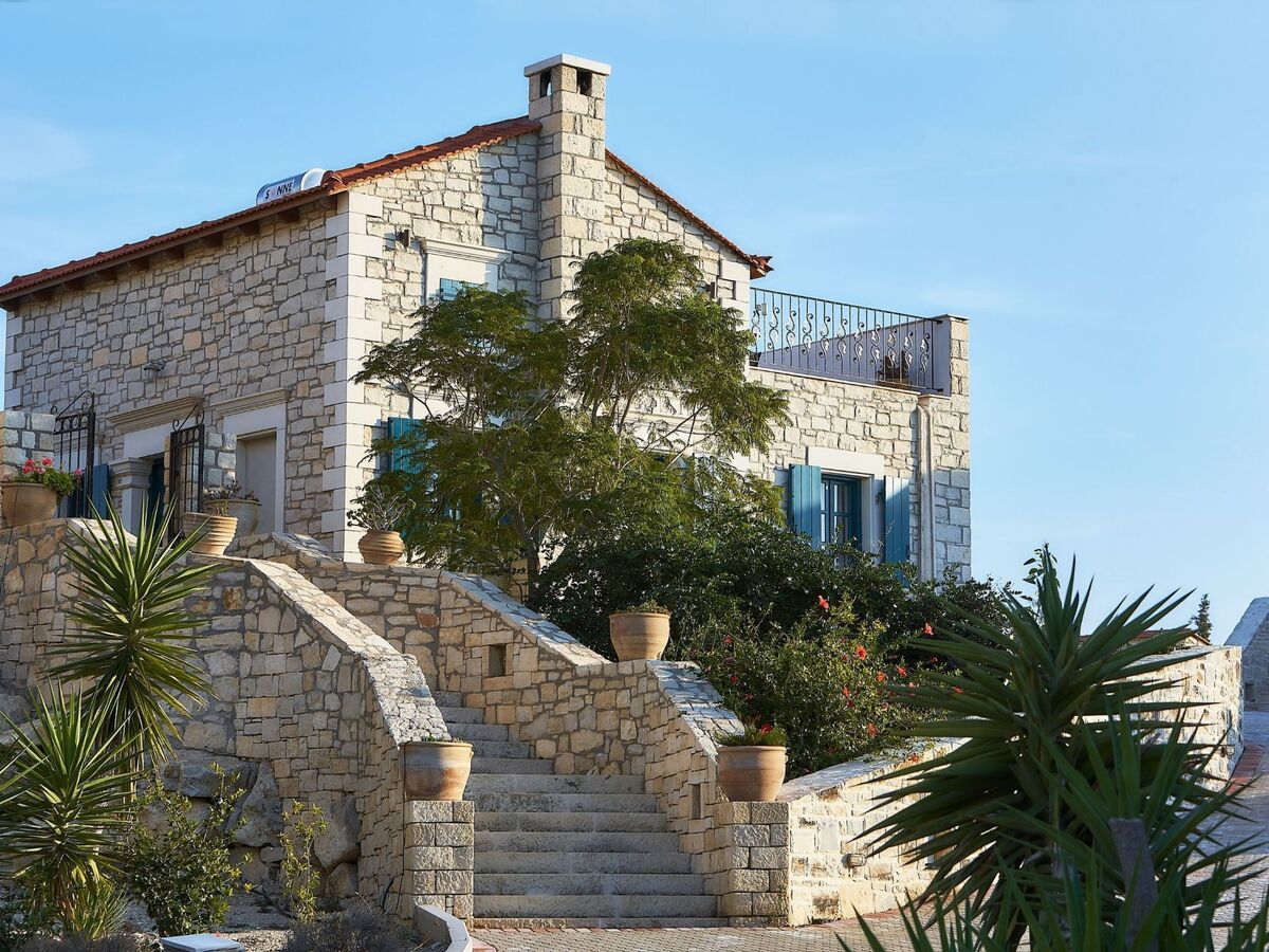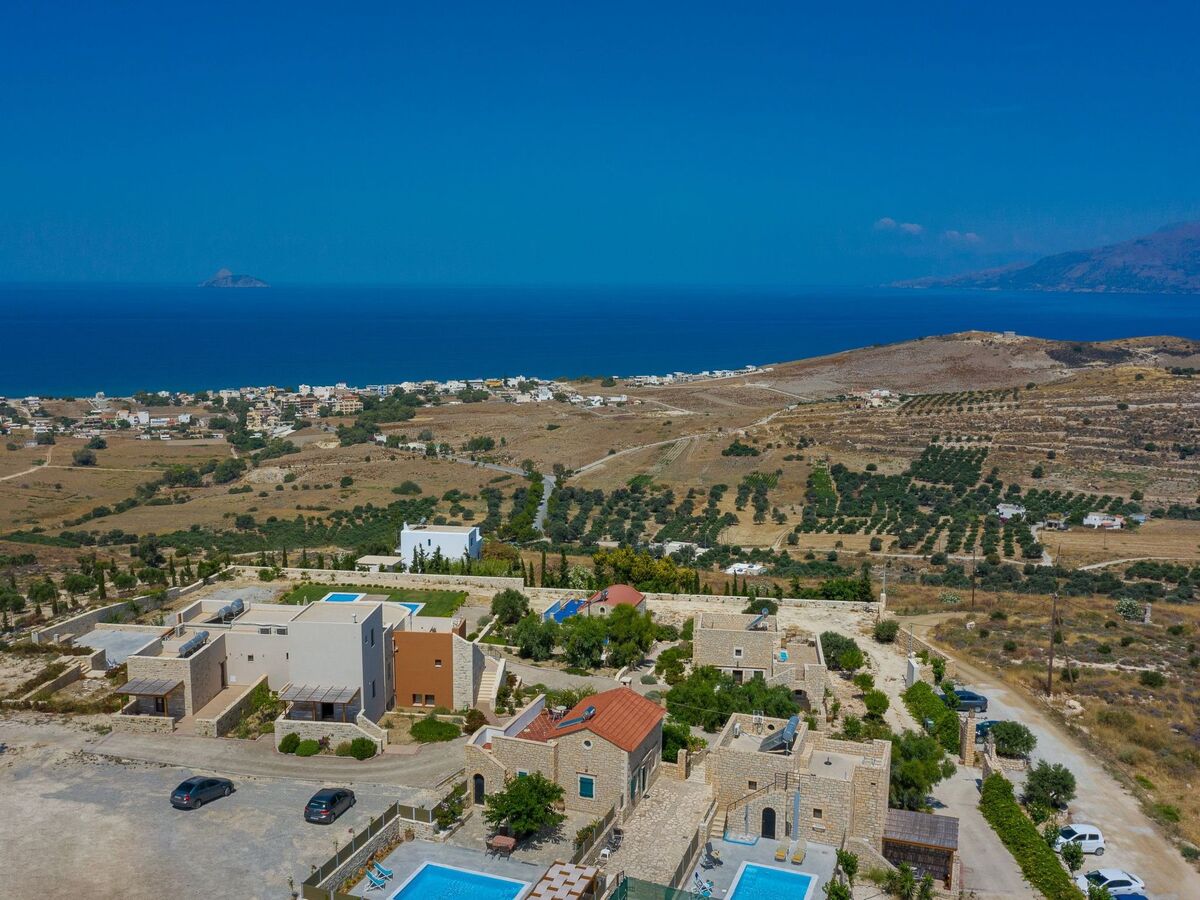 The natural stone villa is located on the crest of a small hill near the village of Kamilari (1km) overlooking the deep blue waters of the Mediterranean Sea and the peak of the Psiloritis mountain range, not far from the beautiful sandy beach of the seaside resort of Kalamaki (2km).