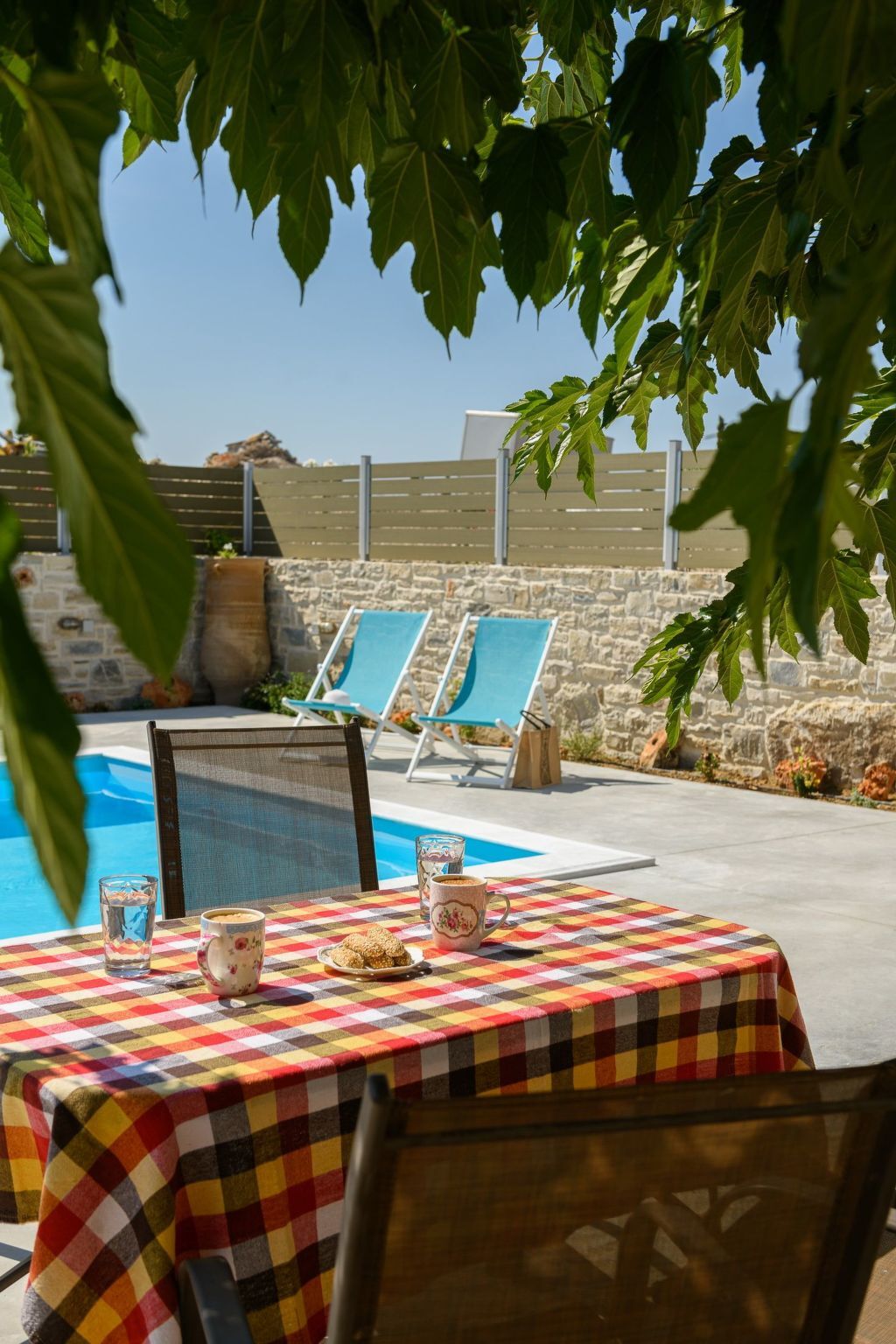 The natural stone villa has its own entrance with a private terrace and a private freshwater pool 6 x 4 m (1.20 m deep) for your exclusive use, so you can enjoy your coffee or your meals in complete serenity at any time of the day.