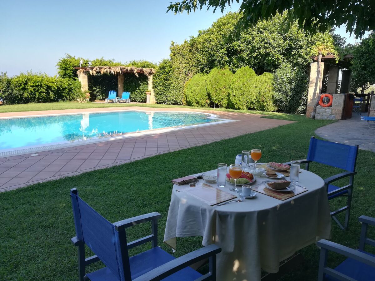 The well-maintained garden surrounds the inviting pool with a sunbathing area, and the property is adorned with olive trees and fragrant laurel bushes.