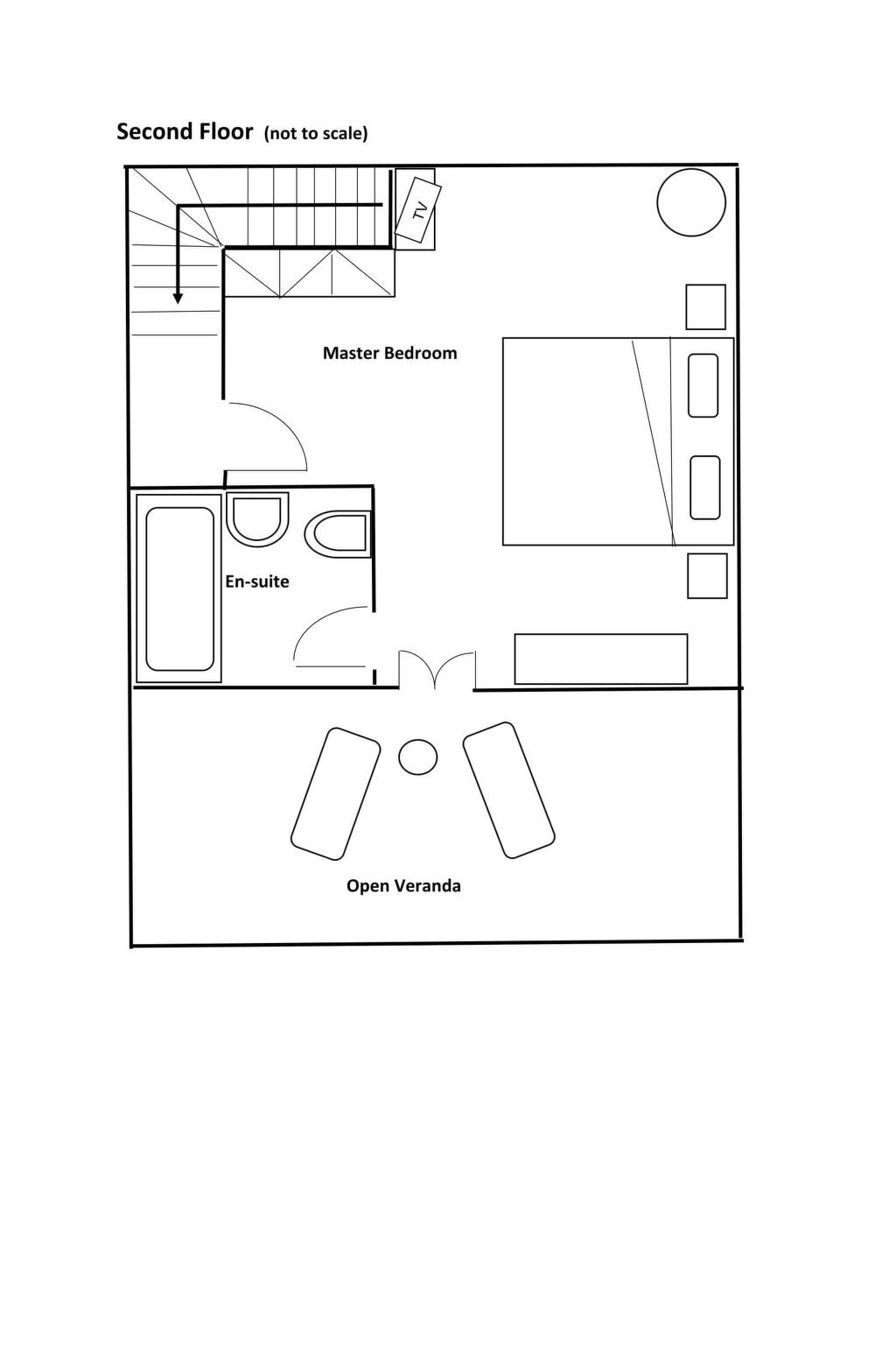 In the tower of the villa is the large master bedroom with a king-size double bed and an en-suite bathroom with bathtub.