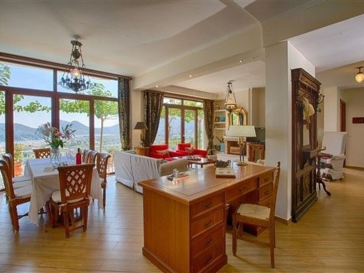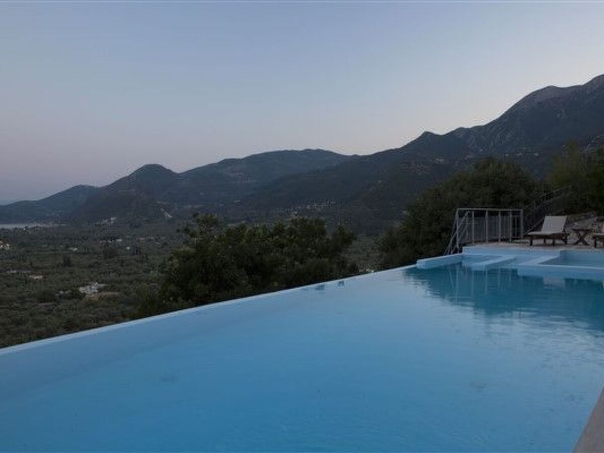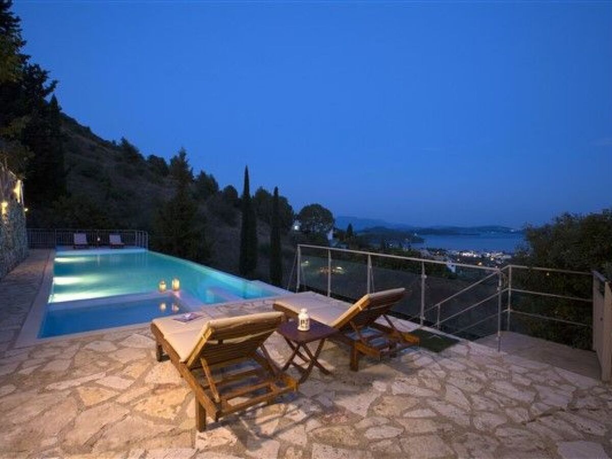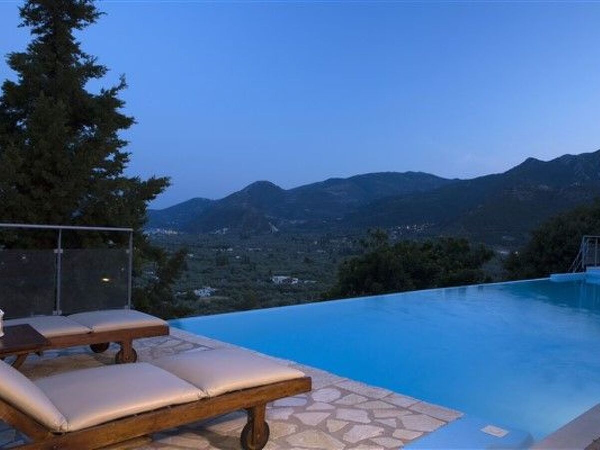 Perched on a hillside, this detached luxury home promises breathtaking panoramic views across Nidri village, the legendary Scorpios island once owned by the shipping magnate Onassis, Meganisi island, the Princess islands, and the vast Ionian Sea.
