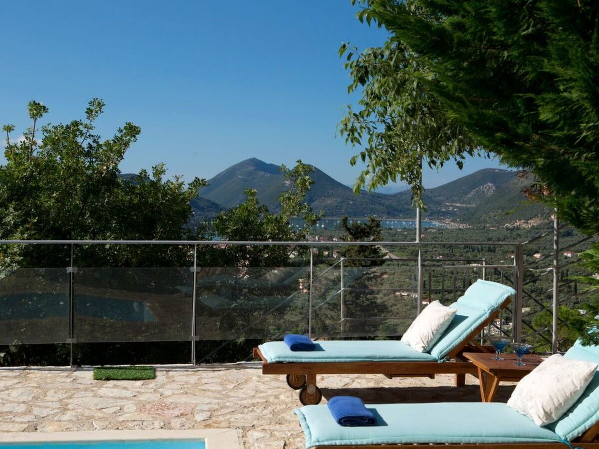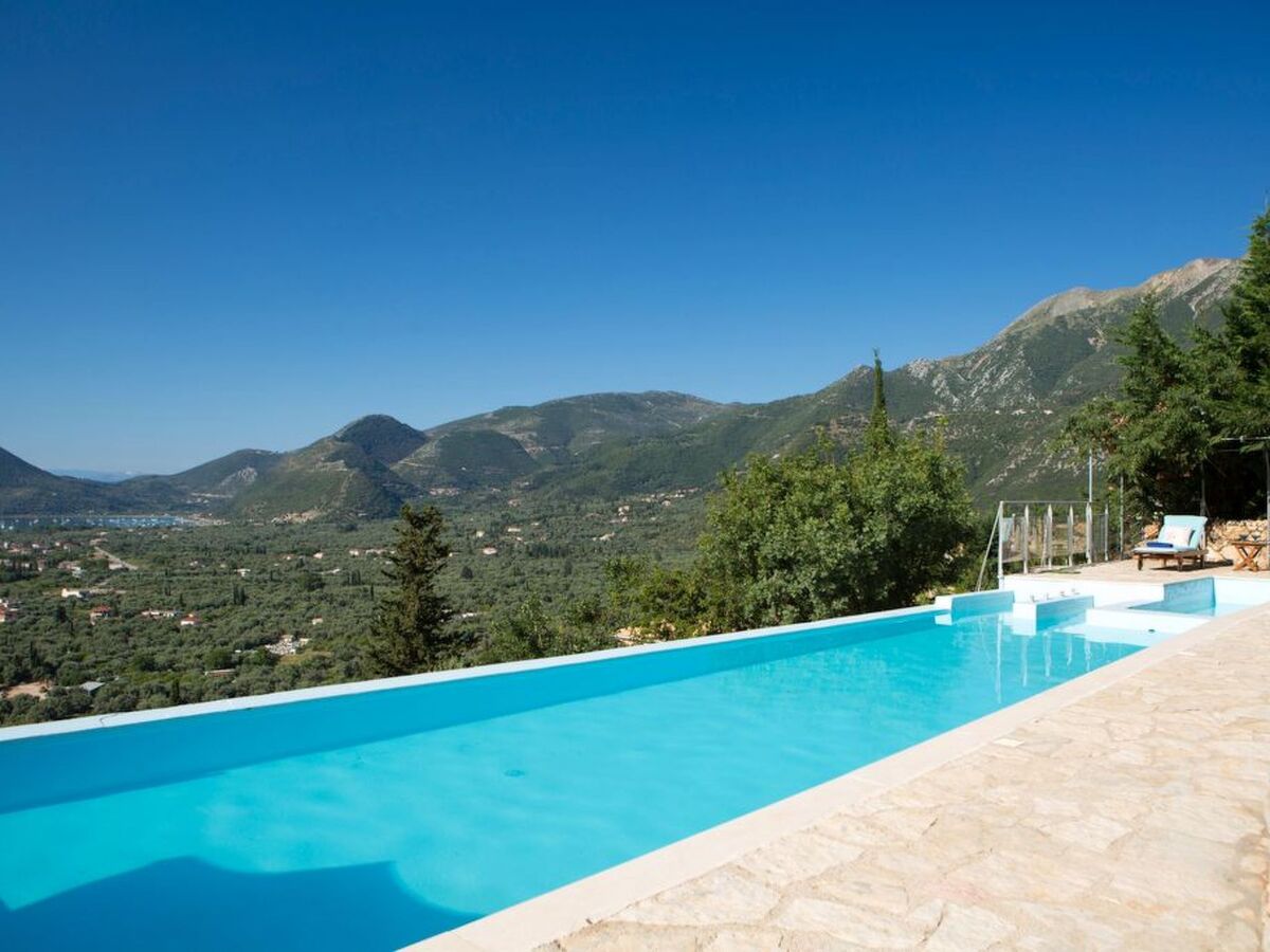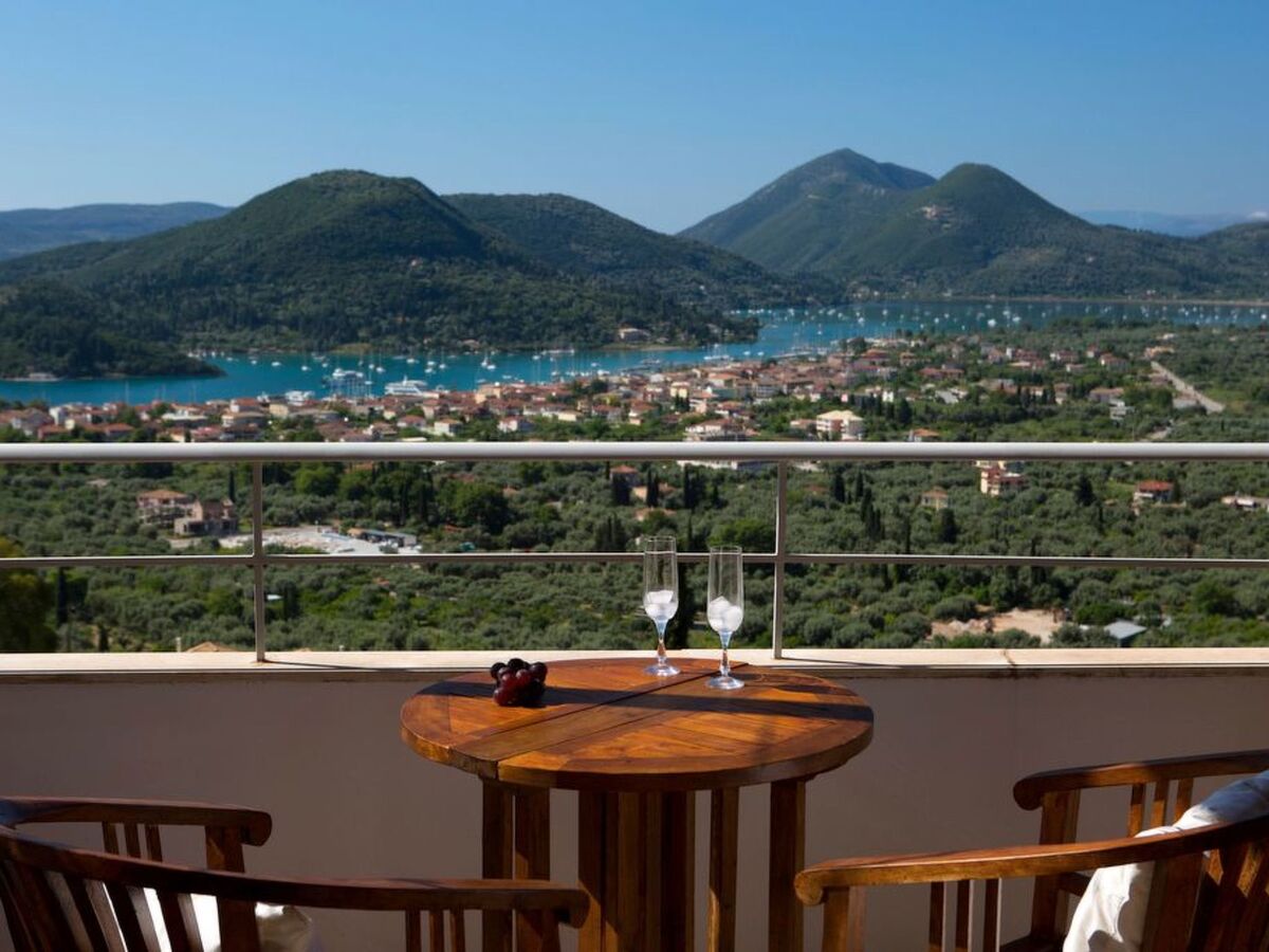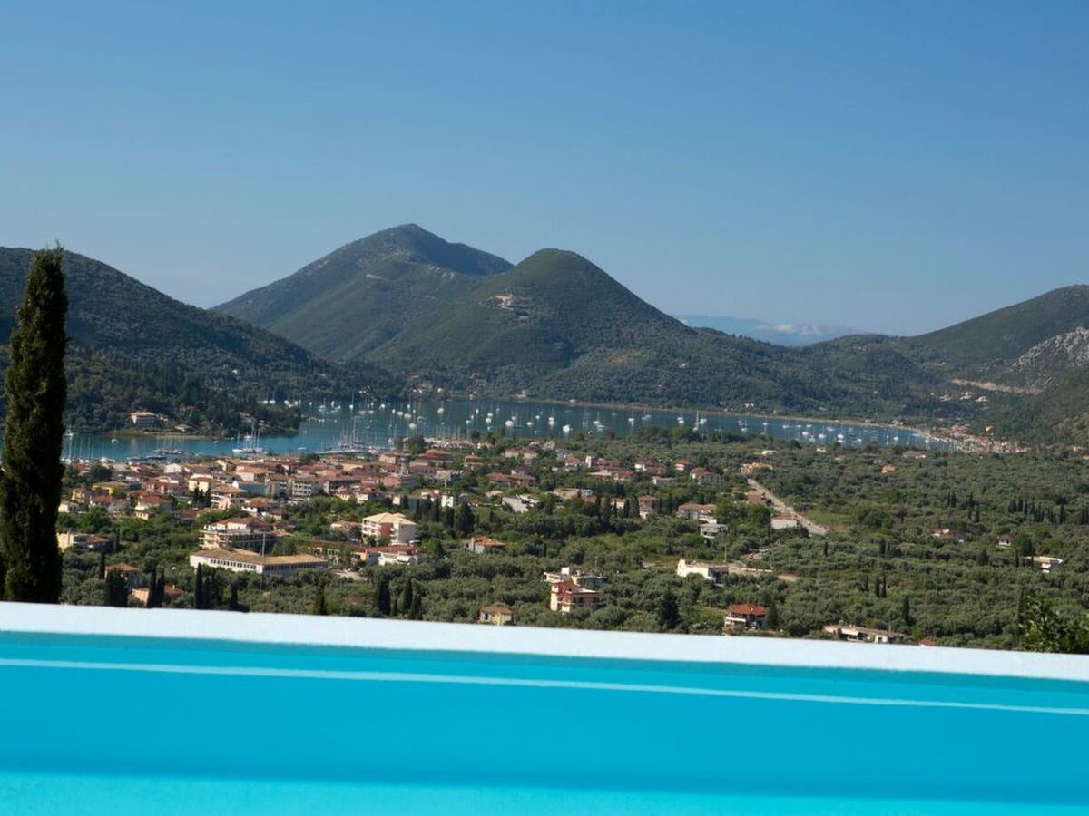 Perched gracefully on a hillside, this prestigious villa boasts sweeping panoramic views of Nidri village, Scorpios island once owned by the renowned shipping magnate Onassis, Meganisi island, Princess islands, and the vast Ionian Sea.