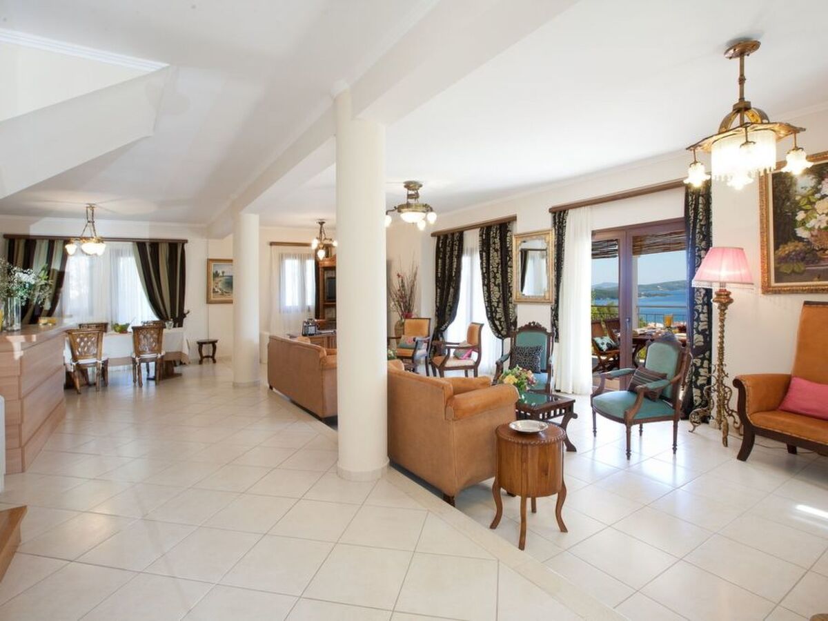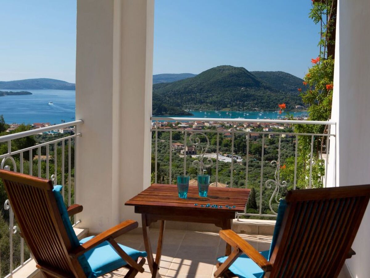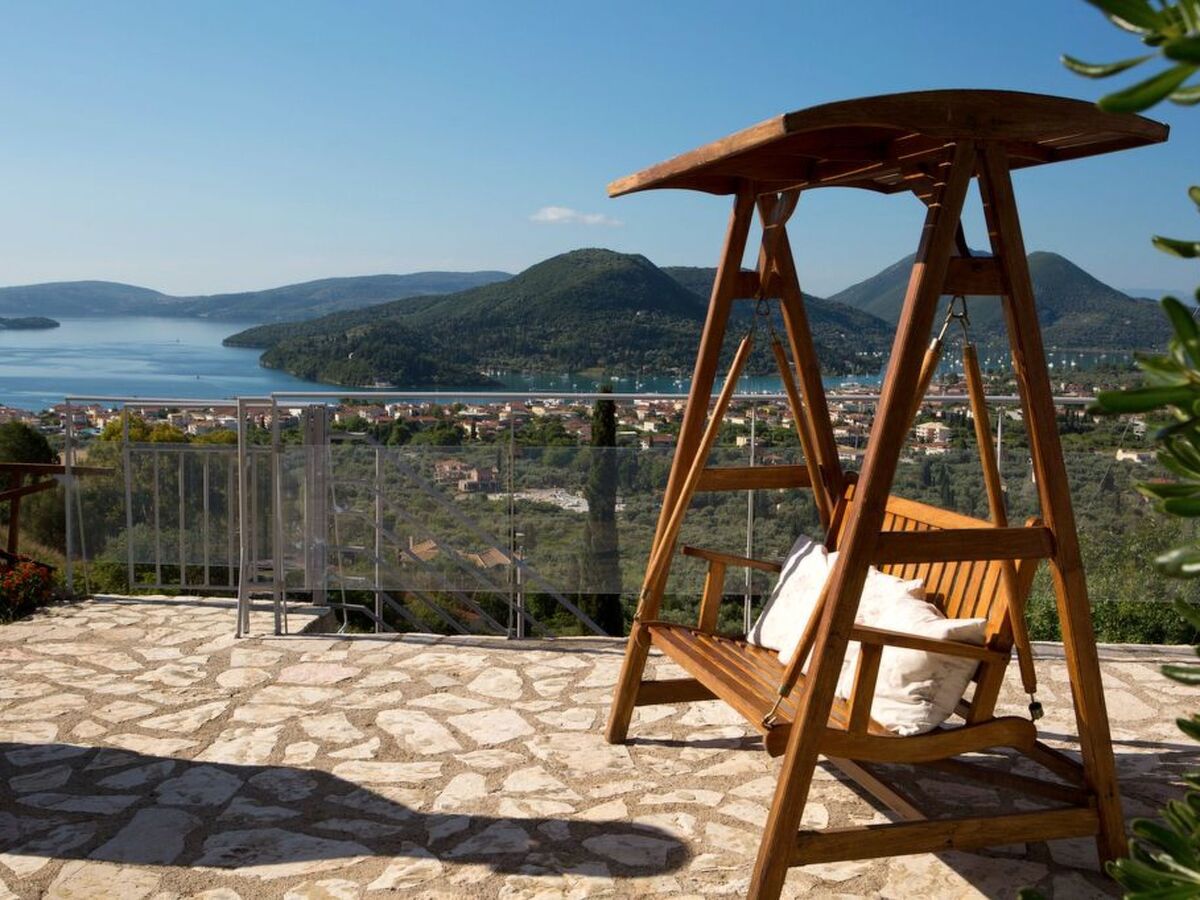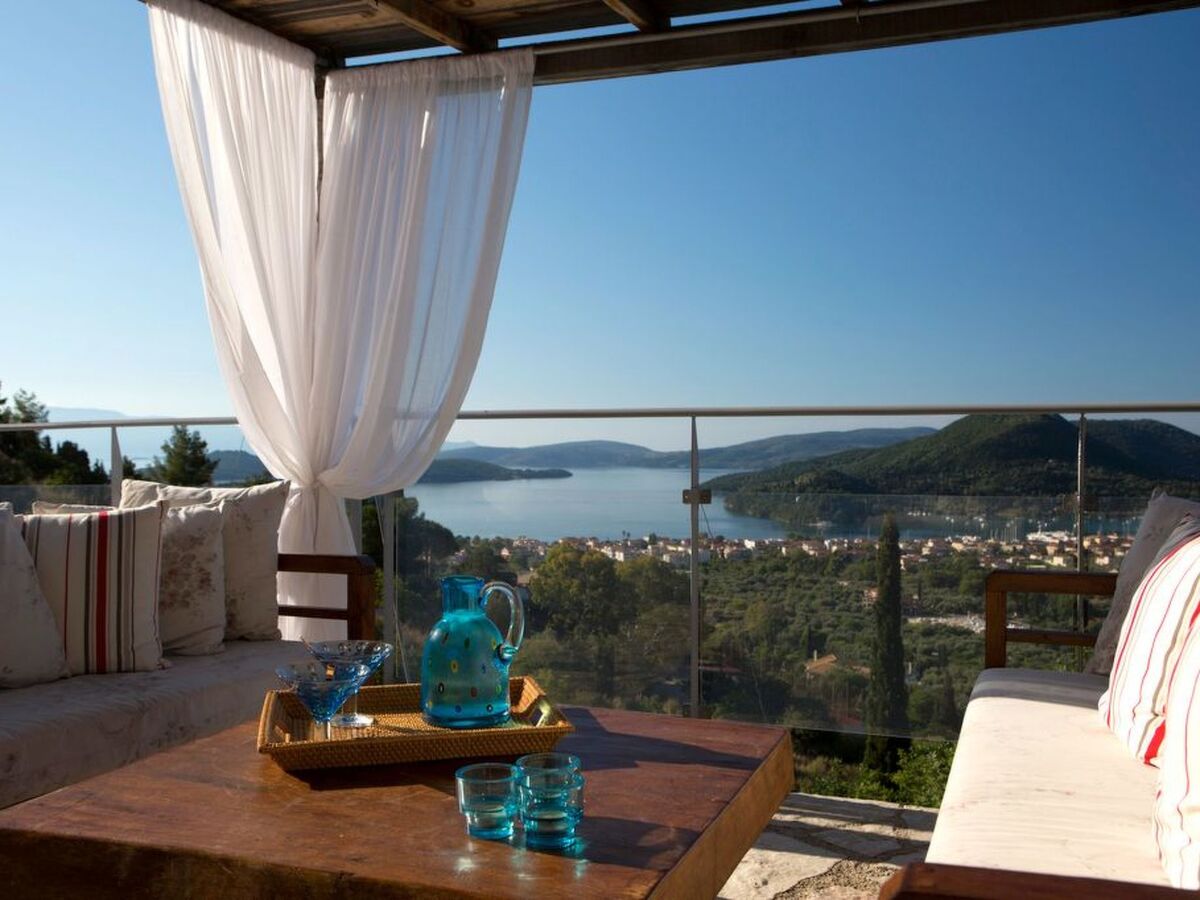 Perched gracefully on a hillside, this prestigious villa boasts sweeping panoramic views of Nidri village, Scorpios island once owned by the renowned shipping magnate Onassis, Meganisi island, Princess islands, and the vast Ionian Sea.