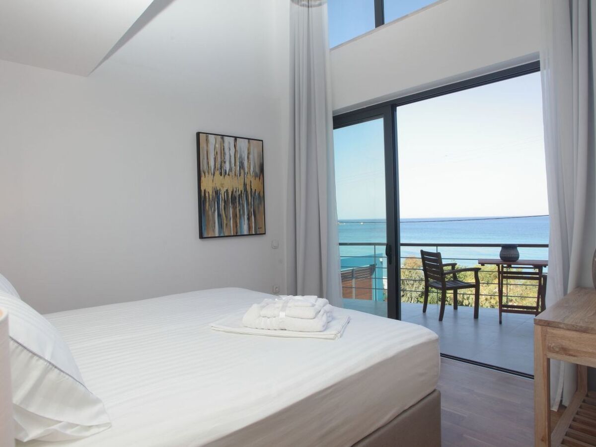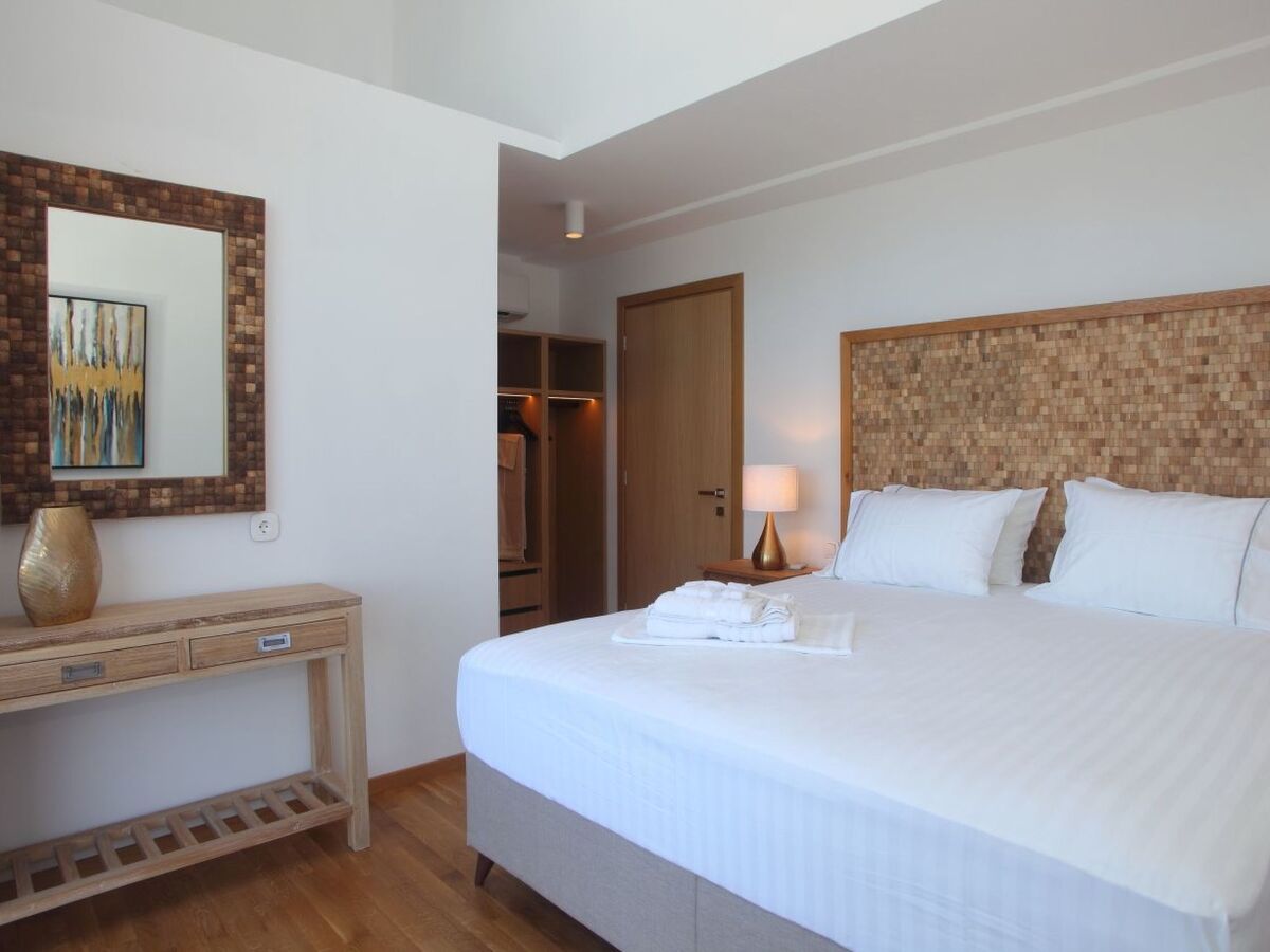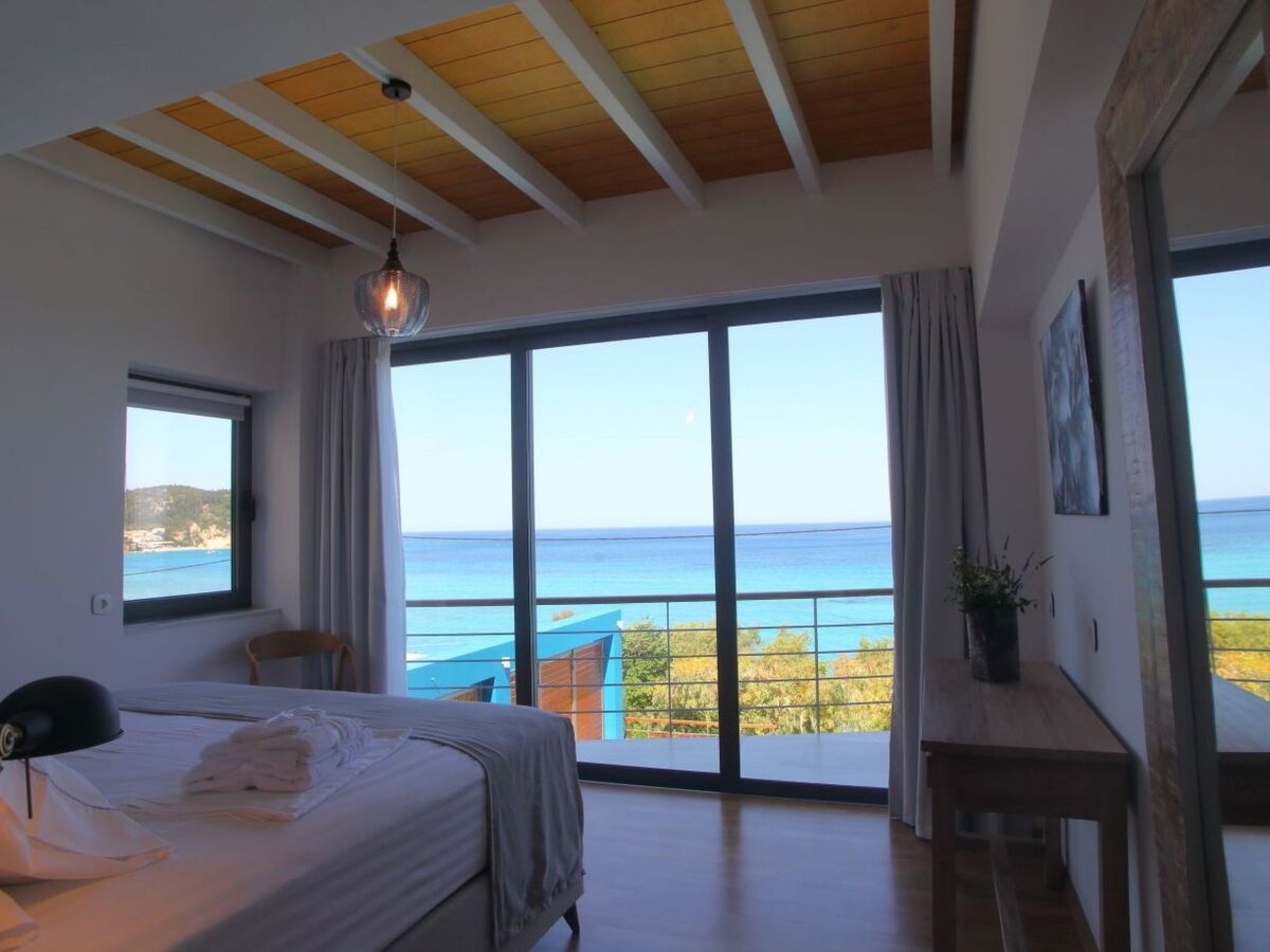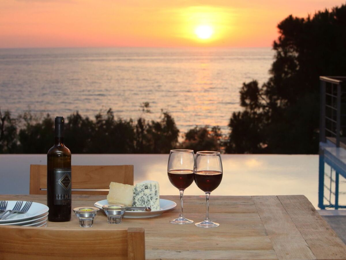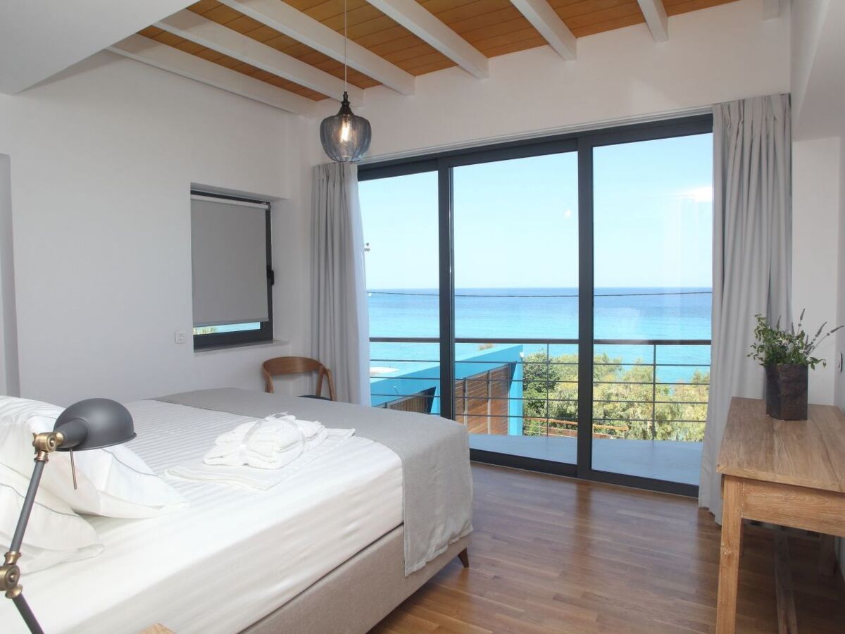 When you enter this fantastic house on the ground floor, there is the spacious living room and kitchen decorated with high quality furniture and glass sliding doors around that allow you to enjoy the infinite blue of the sea and the beauty of the Greek sky.On the upper floors you will find five king size modern en-suite bedrooms , from which you can enjoy the sea view through the large glass windows.Inside the villa compliments a fully equipped kitchen area, including oven, fridge-freezer, dishwasher, kettle, coffee-maker, and all kitchen utensils, so you can enjoy cooking with a view, along with washing machine, Wi-Fi, bed linen, bath and pool towels and many additional features to complete your holiday experience.Being on a slightly elevated level, 50m from the sea, the house offers superb views across the water whether from the comfortable armchairs on the terrace or one of the sunbeds on the decking of the swimming pool or even inside the infinity swimming poolThe bed positioning and room layout allows you to take in views of the Mediterranean and its beautiful sunsets from wherever you are.During the day, big balconies help you enjoy the sublime lines of waves and during the night, the illuminated coastline from Agios Nikitas village stretching like a painting in front of you.