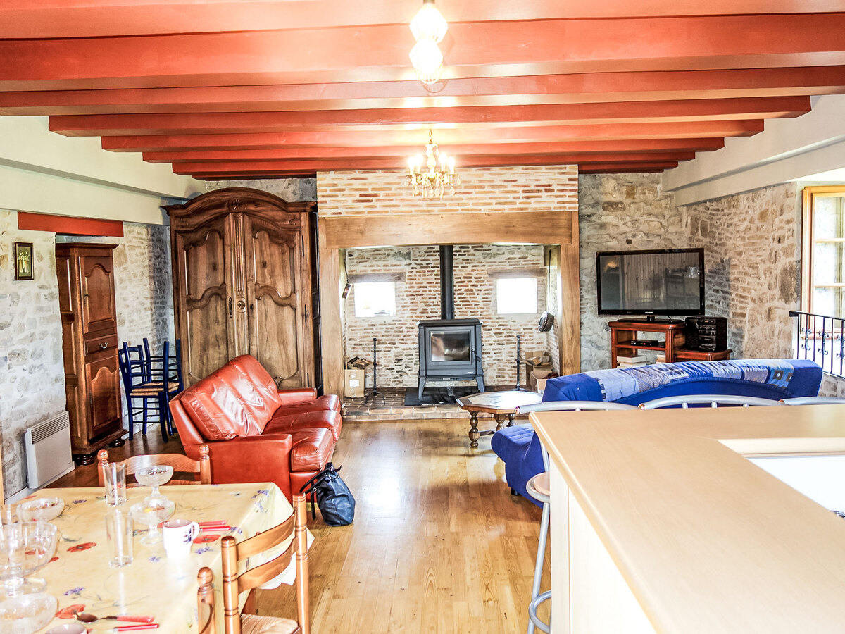 Aménagement agréable et rustique: séjour/salle à manger avec cheminée et TV (écran plat), chaîne stéréo.