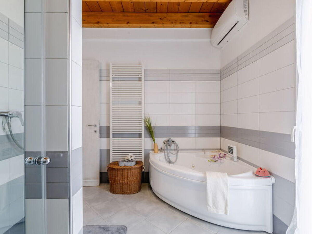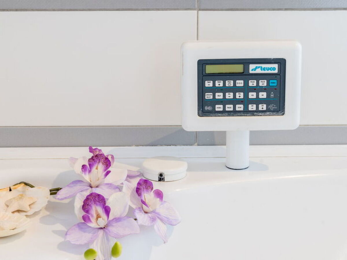 La salle de bain est équipée d'une baignoire hydromassante, idéale pour se détendre après une journée de découvertes.