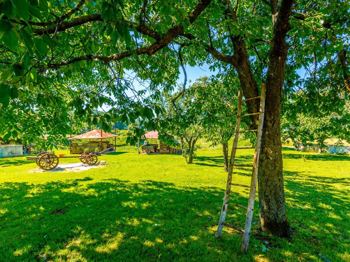 Surrounded by a adorable green lawn on which proudly stand a chestnut and a cherry tree, with an old wagon decorated with pots of fragrant flowers in the background, this home is ideal for families with children.