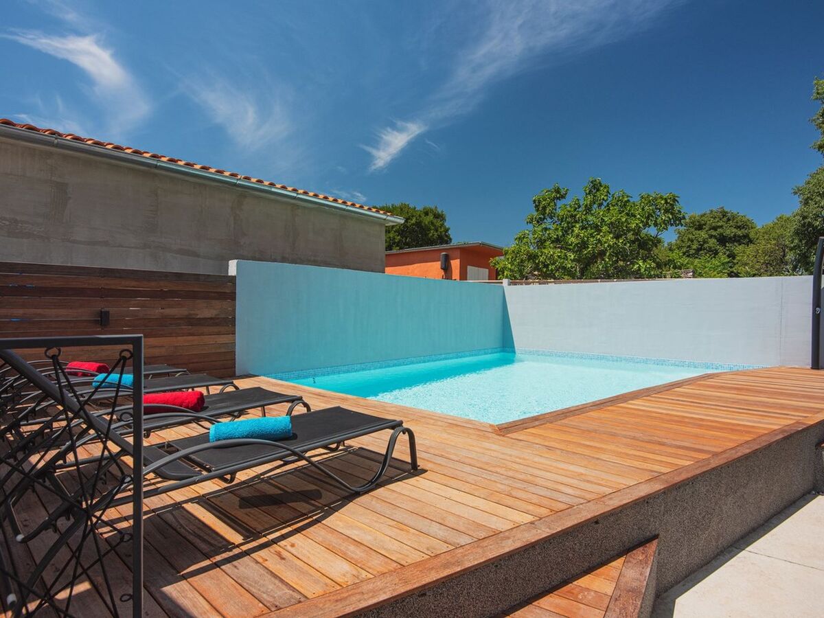 The exterior of this villa is dominated by an outdoor private pool surrounded by a sun terrace with sun loungers, and there is a lawn with swings for the youngest guests nearby.