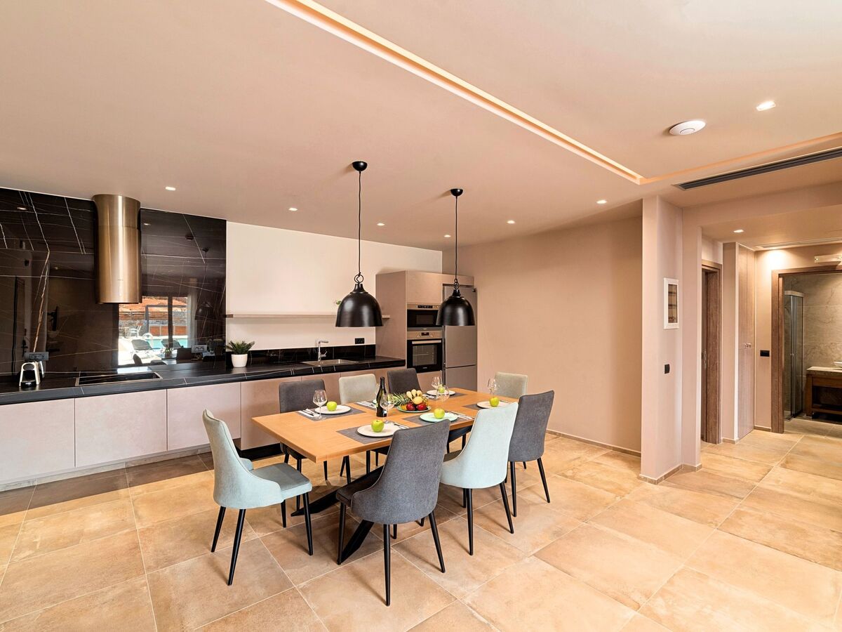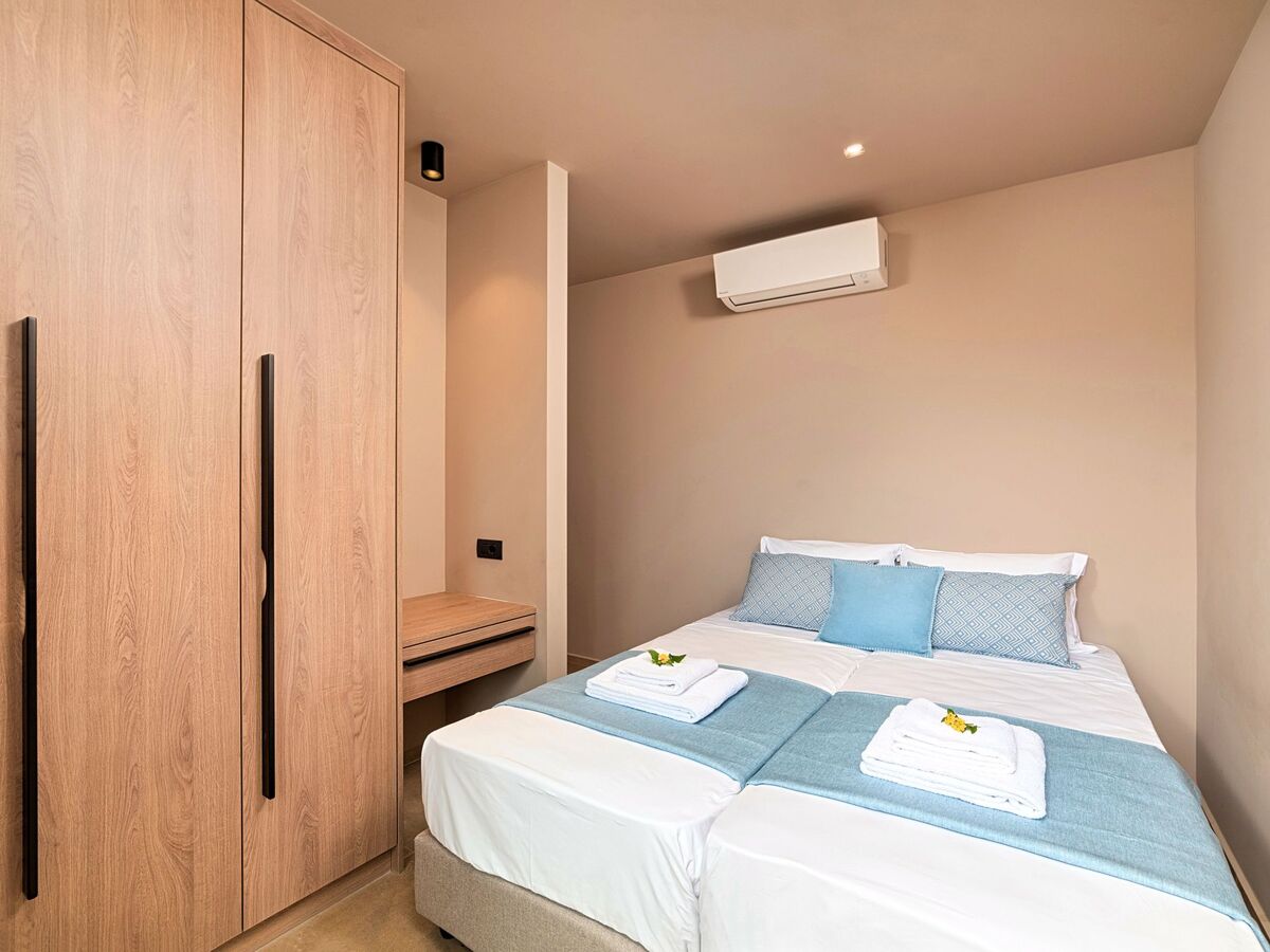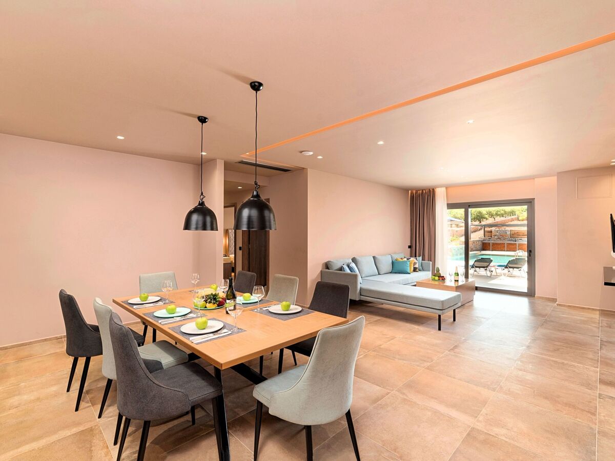 Ground floor● A bedroom with two single pushed together beds and private bathroom.● A bedroom with two single pushed together beds and private bathroom Upper floor● A living room with a large corner sofa (can accommodate two beds) and direct access to the terrace and the pool area.● Smart TV at the living room● Large Kitchen / dining area with an oven, a fridge, a coffee maker, tea facilities, a juicer, a toaster and a dish set.● A bedroom with a queen-size double bed.
