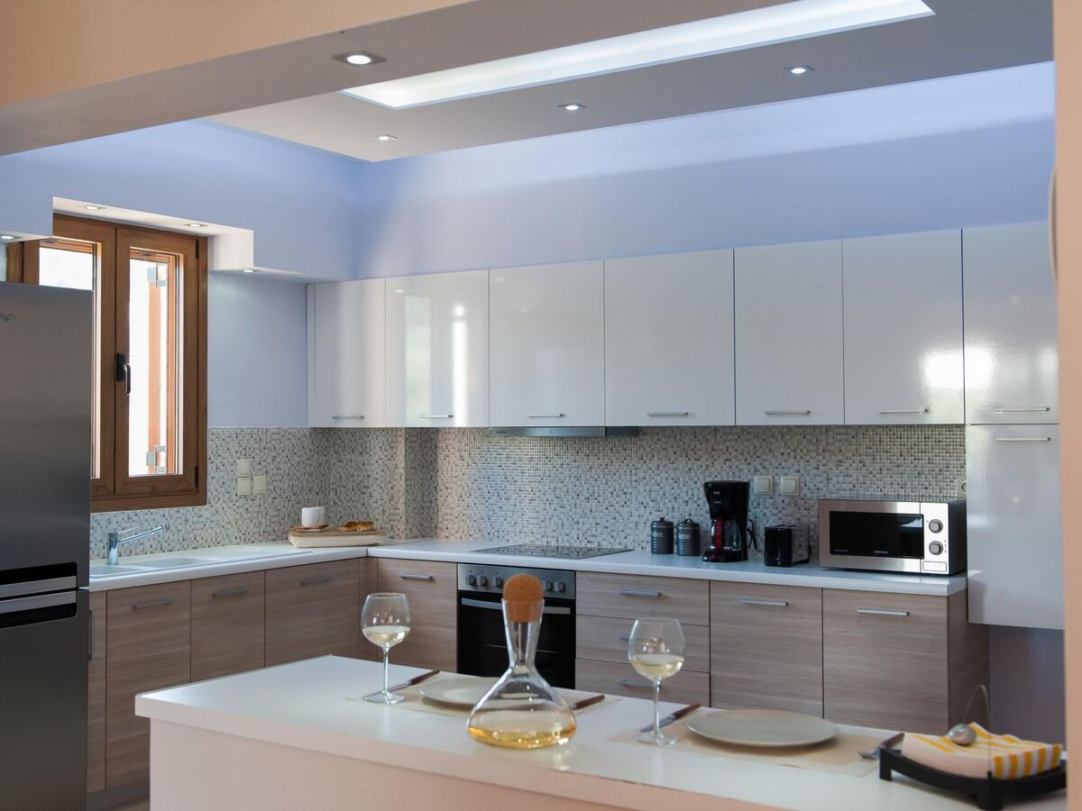 Inside, the villa boasts a generous living room furnished with a large corner sofa, a cozy fireplace for cooler evenings, and air conditioning for warmer days.