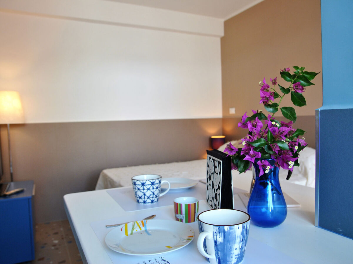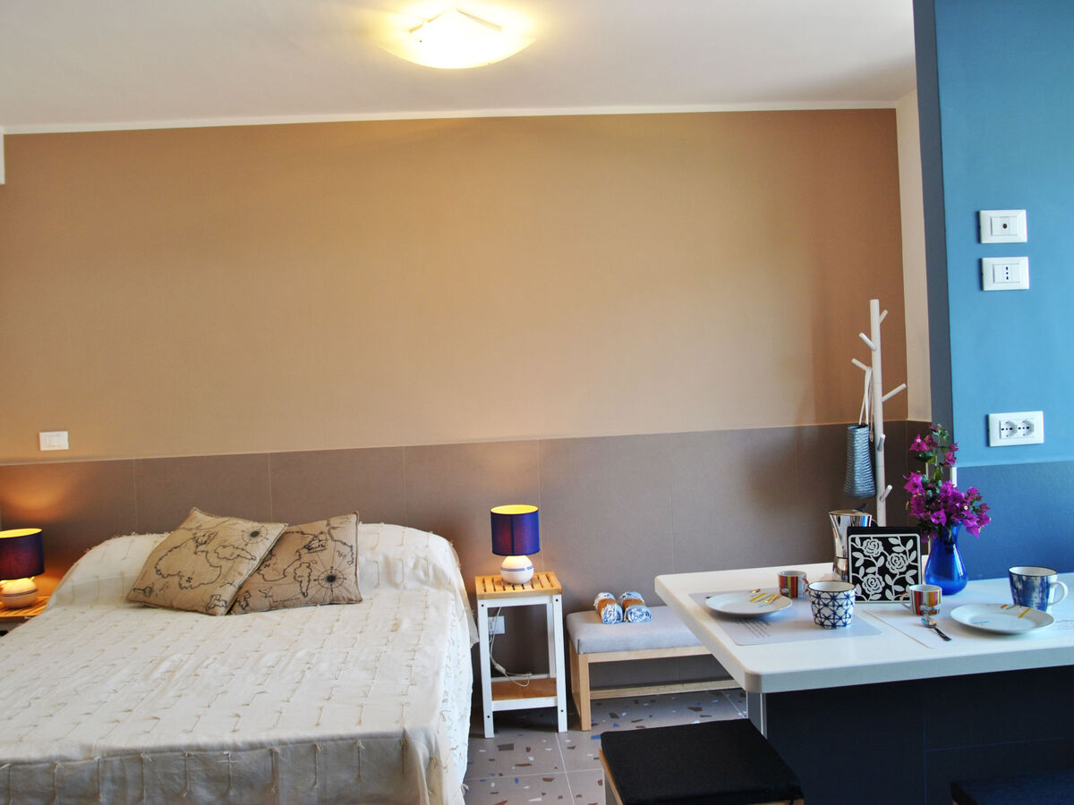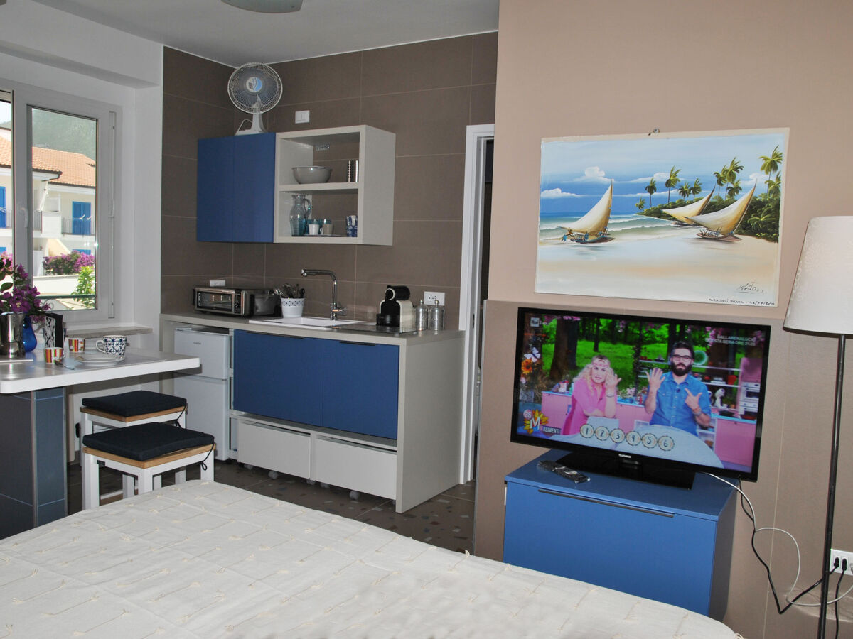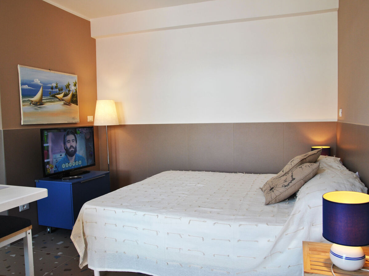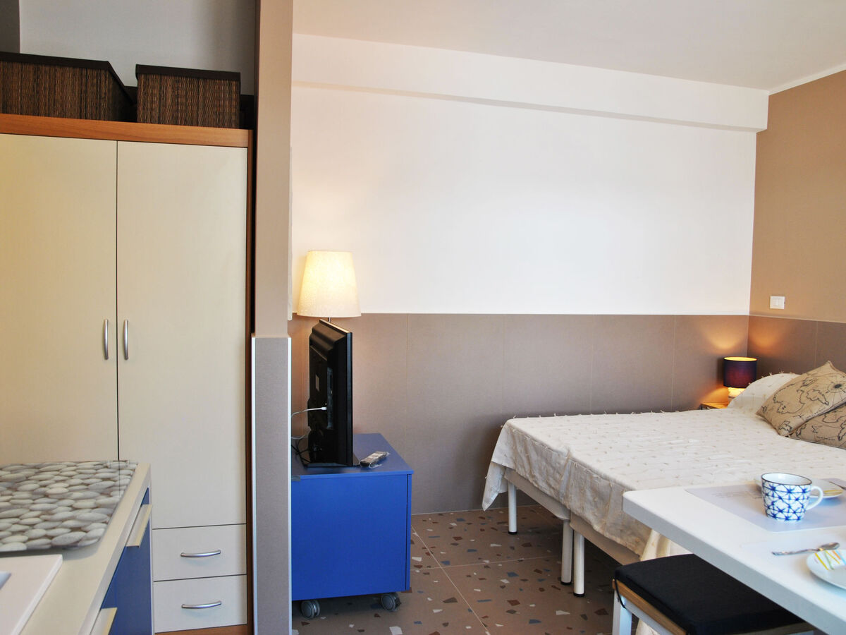 Rénové, aménagement moderne: séjour/chambre à coucher avec 1 lit, 1 lit double, coin repas, coin-cuisine et TV (écran plat).