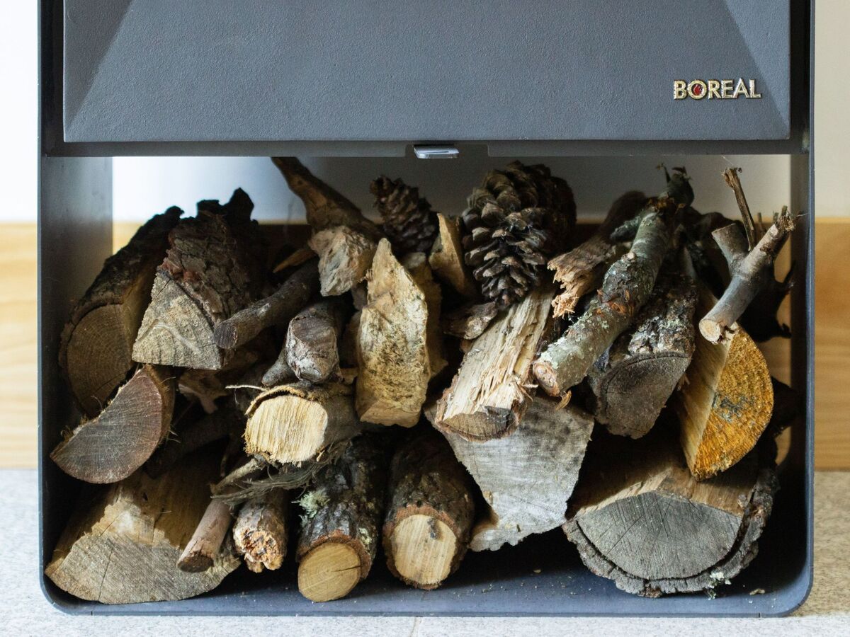 – Living room with a wood stove, round dining table, chairs, sofa, and television.