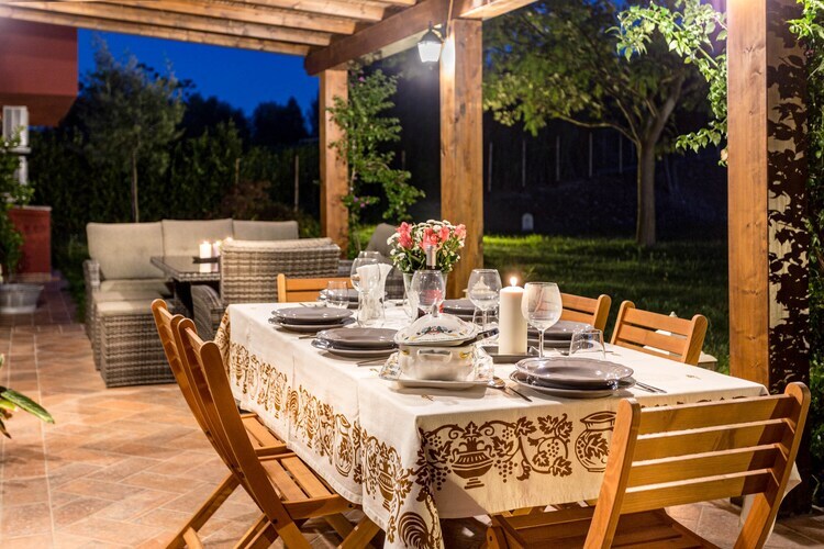 Rez-de-chaussée: (cuisine ouverte(bouilloire, grille-pain, cafetière/percolateur, four, micro ondes, lave-vaisselle , combinaison réfrigérateur/congélateur, ), salle à manger-salon(canapé-lit double, TV(satellite), table, cheminée, coin salon), salle de bains(douche)) Au 1er étage: (chambre(lit double), chambre(lit double), chambre(lit double), chambre(lit simple, lit simple), salle de bains(douche)) Meubles de jardin, sèche-linge, solarium, lave-linge , chauffage(central), climatisation, jardin, barbecue, parking, piscine(privé)