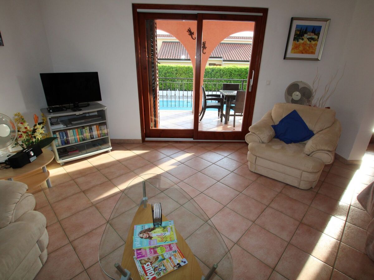 The living room opens through large doors directly onto the covered terrace with garden furniture and onto the outdoor pool.