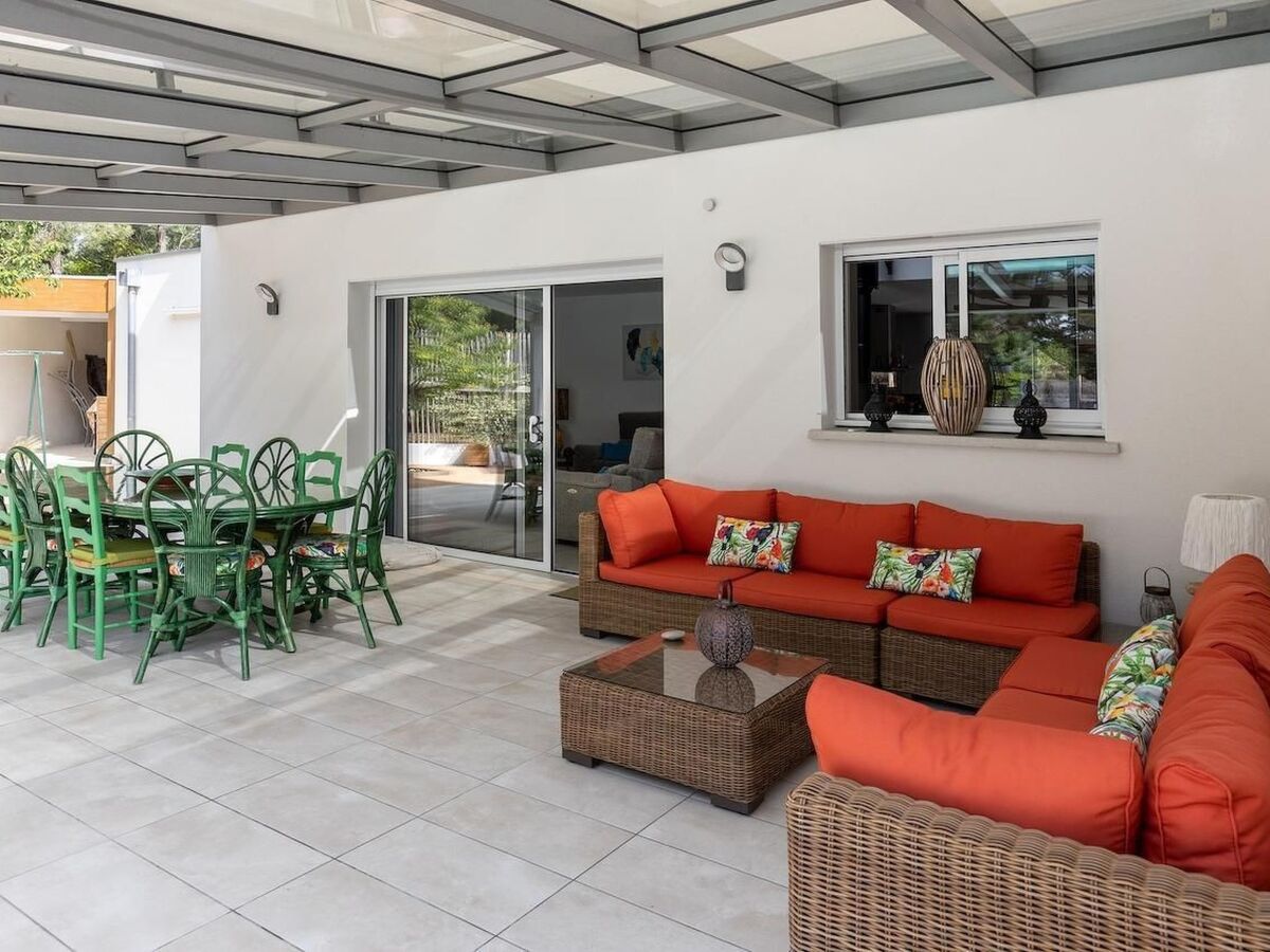 Une terrasse de 32 m² couverte avec un salon extérieur et une table pour 10 personnes.