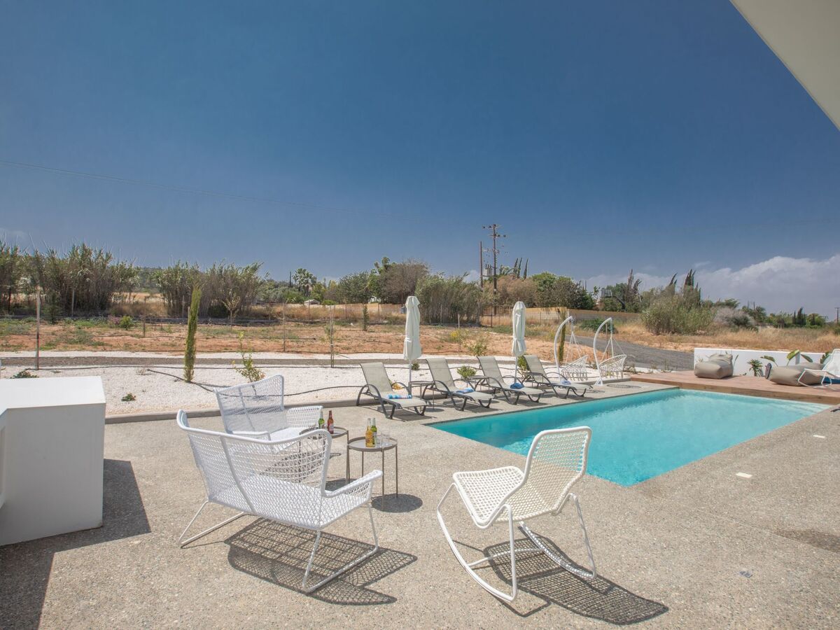 Outside, the beautiful and sizeable garden, one of the main attractions, offers a barbecue, shaded dining area with seating for 8 people, extra seating area with a small table and chairs, two hanging chairs, sunloungers, and a large private pool, ideal for hot days lazing in the Cyprus sun, and evenings of entertaining.