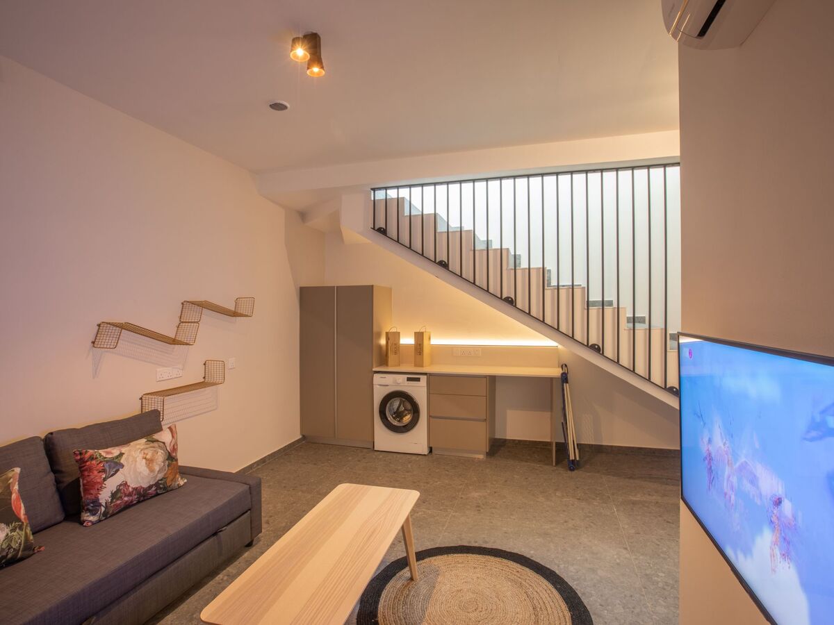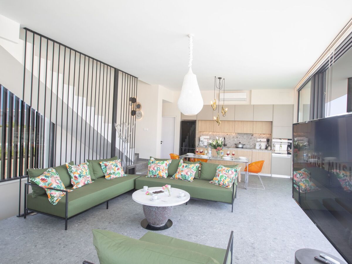 The living room features comfortable sofas and widescreen Smart TV with satellite channels.