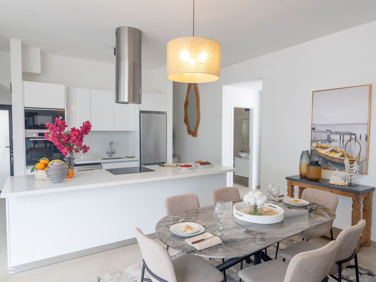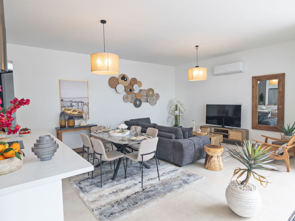 The villa features a spacious open-plan ground floor, where the living room, dining area, and fully equipped kitchen seamlessly connect, creating a bright and inviting atmosphere.