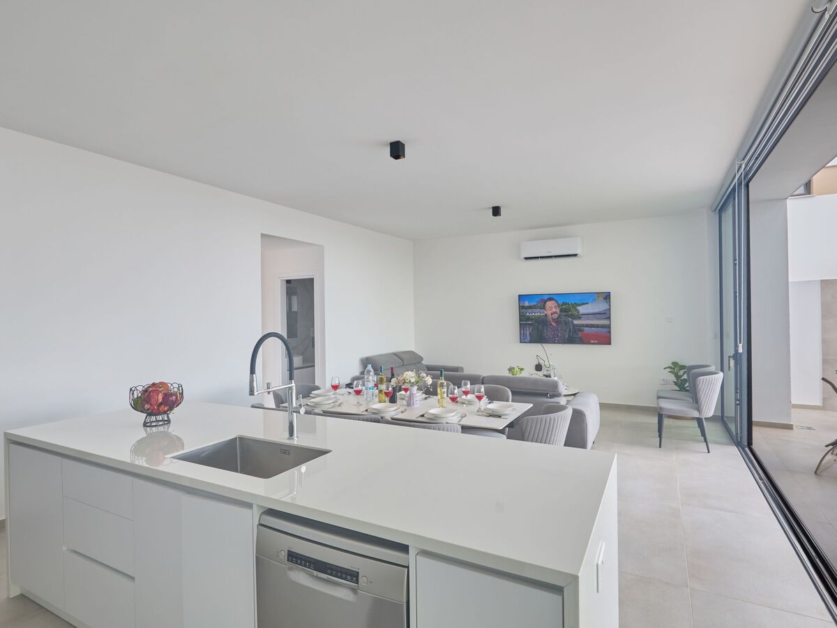 The villa boasts a spacious open-plan ground floor, where the living room, dining area, and fully equipped kitchen seamlessly flow together, creating a bright and inviting atmosphere.