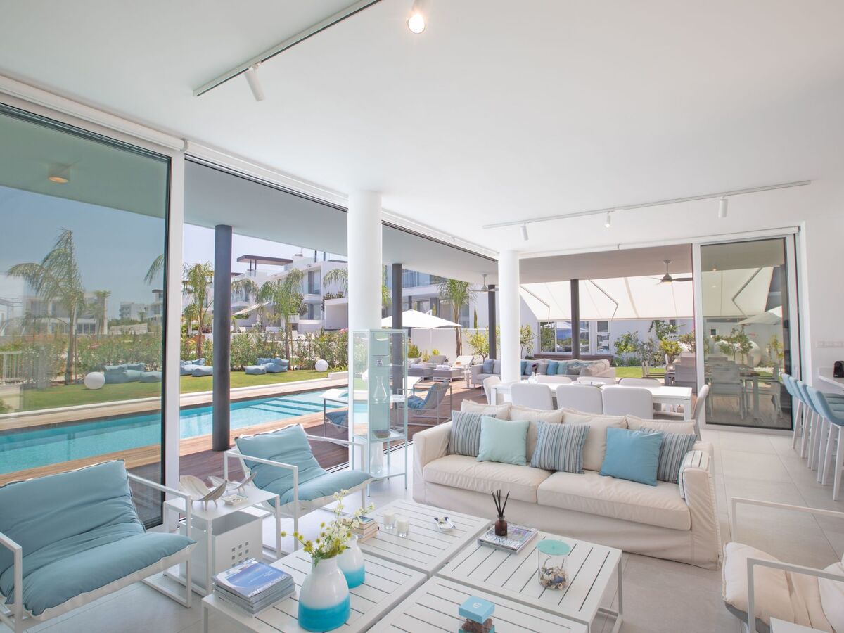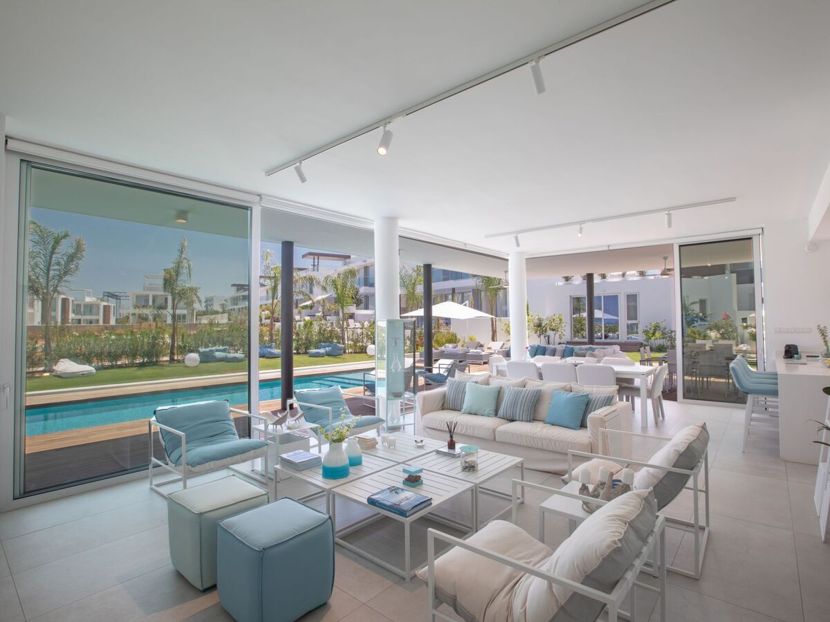 As you enter the villa, you will find the grand and highly stylish open-plan living room, kitchen and dining area, surrounded by bi-fold patio doors leading to the garden and pool area