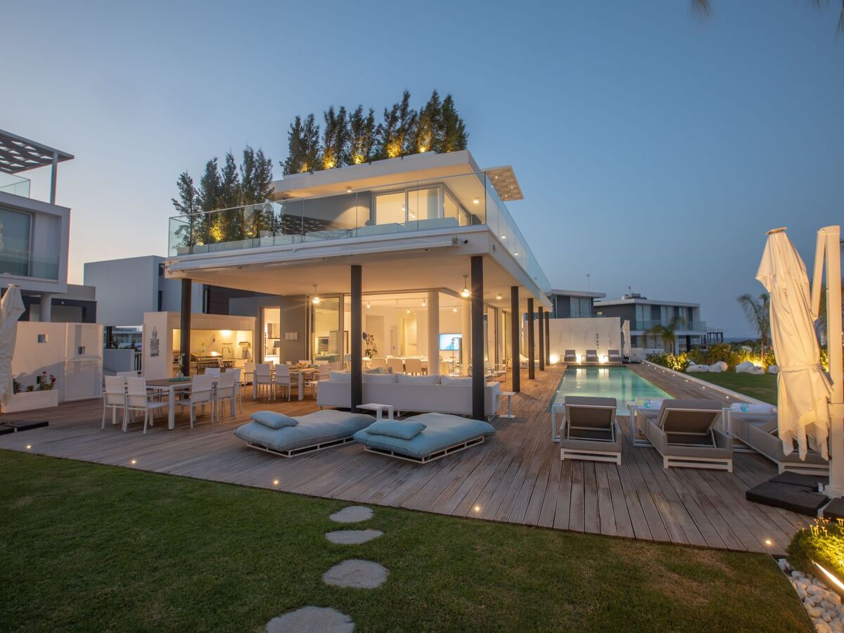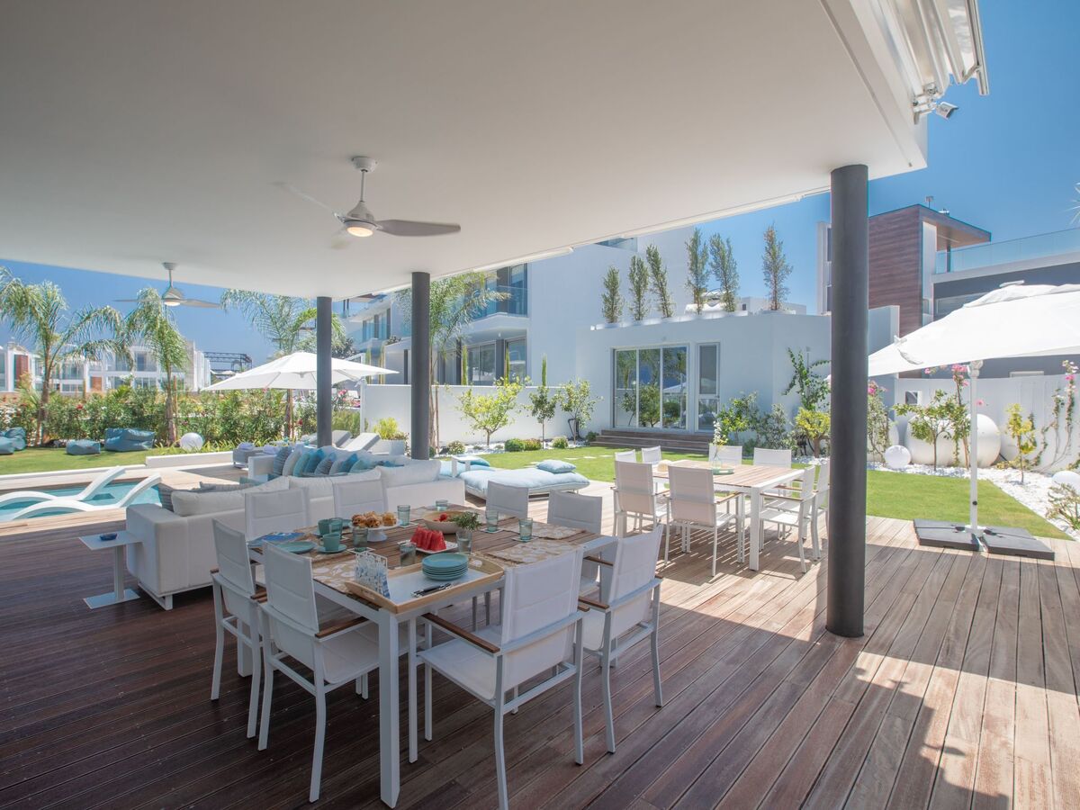 Outside, the vast garden with modern decking and beautiful landscaping offers a barbecue, two outside dining areas, comfortable corner sofa, sun-loungers and large private pool, perfect for long days basking in the Cyprus sun and basking in the lavishness of it all