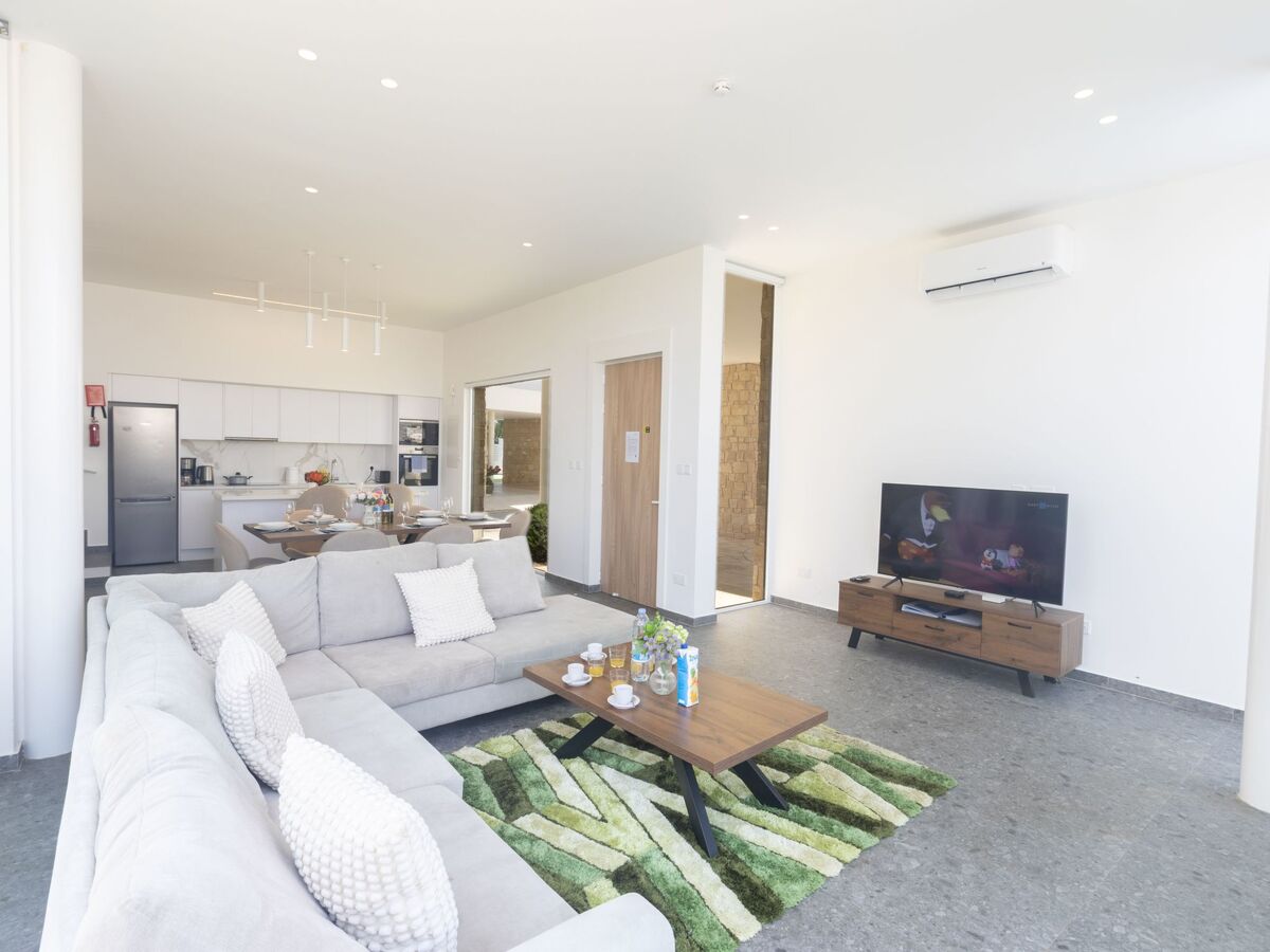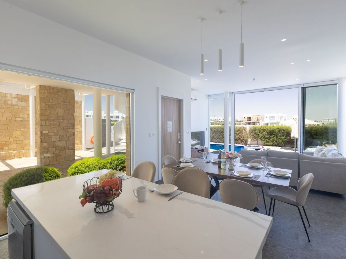 Le salon est équipé d'un canapé d'angle confortable et d'une télévision à écran large, la salle à manger dispose d'une table et de sièges pour 6 personnes, et l'élégante cuisine entièrement équipée comprend un bar à petit-déjeuner avec des sièges supplémentaires pour 2 personnes.