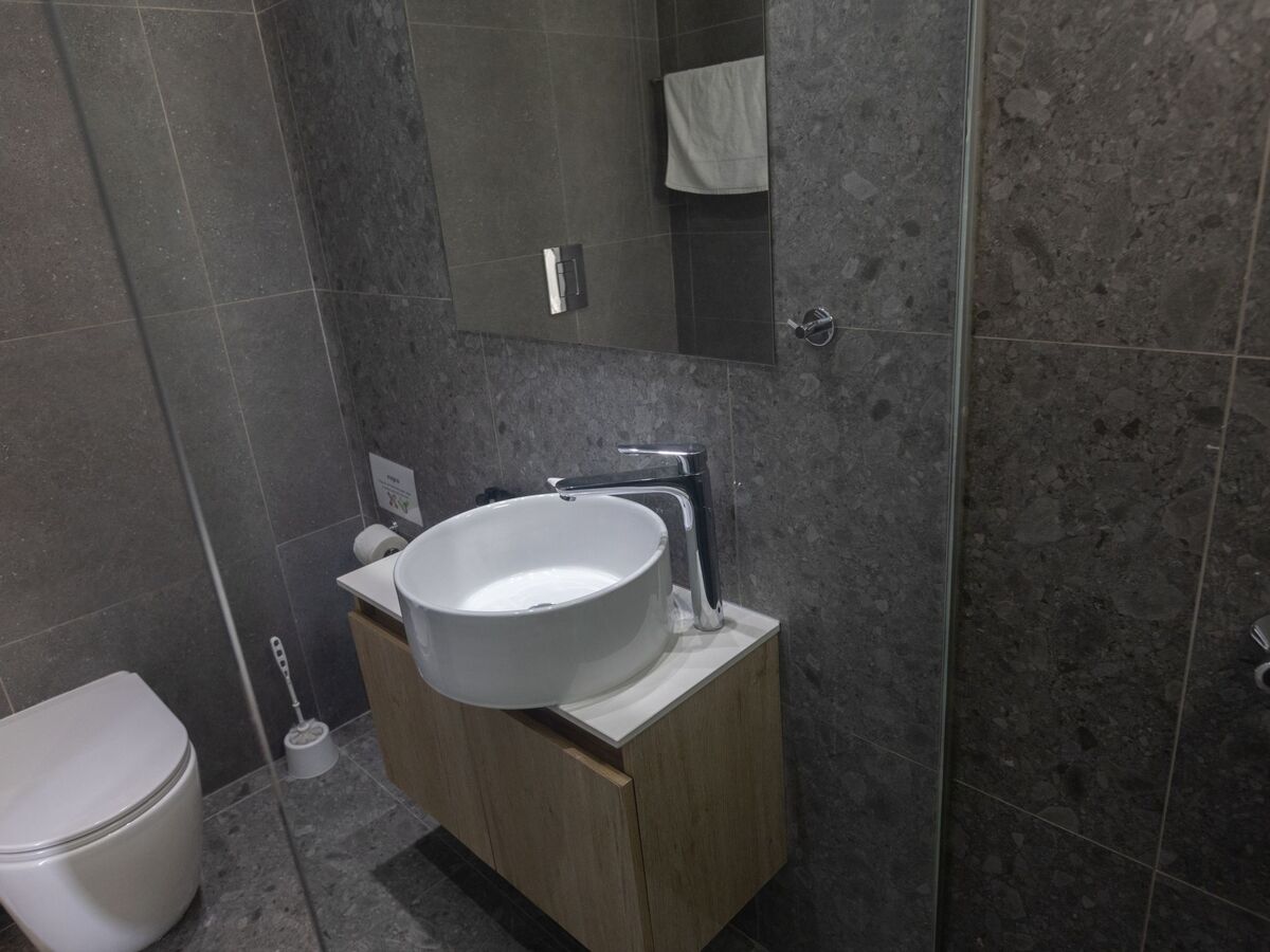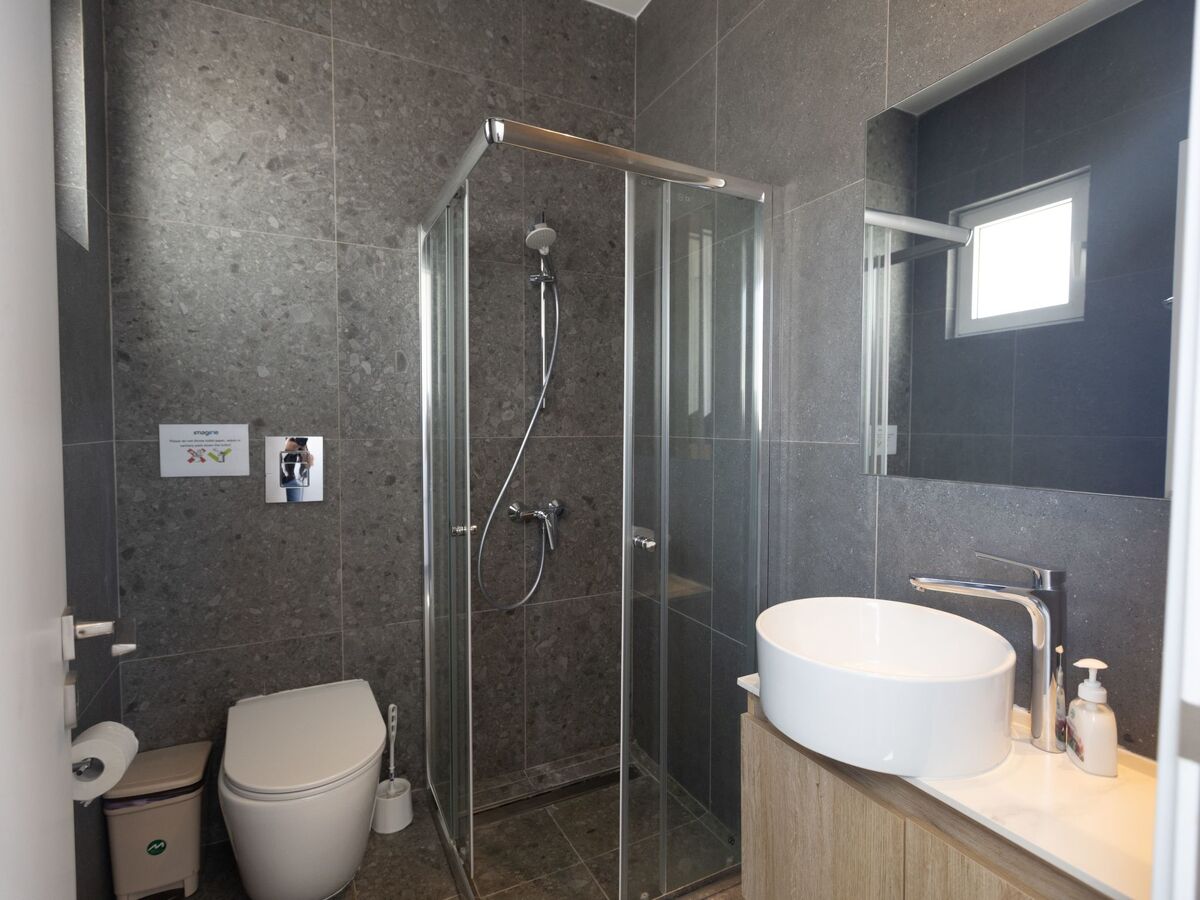 La salle de bains principale est équipée d'une douche et de toilettes.