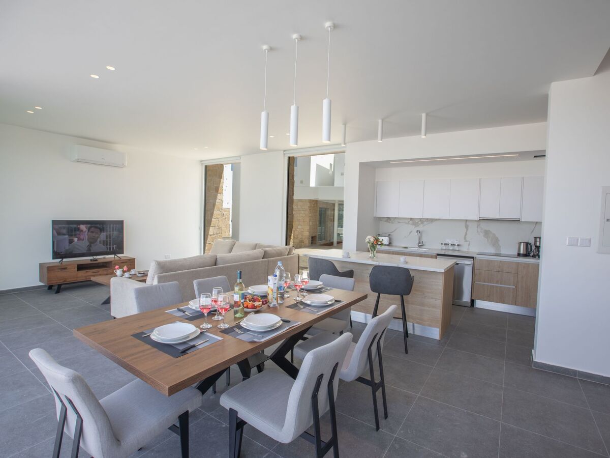 The living room is complete with a comfortable corner sofa and widescreen smart TV, the dining area has table and seating for 6 persons, and the stylish fully-equipped kitchen includes a breakfast bar with extra seating for 2 people.