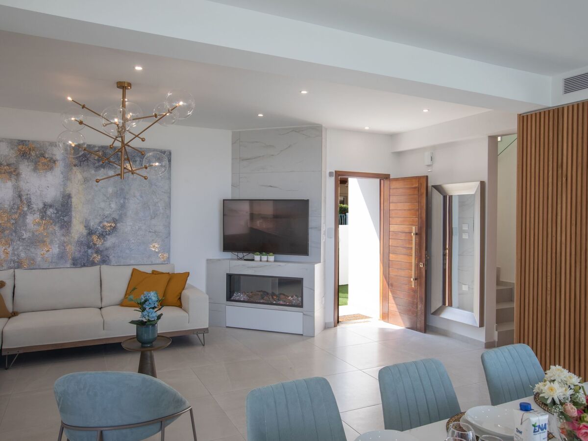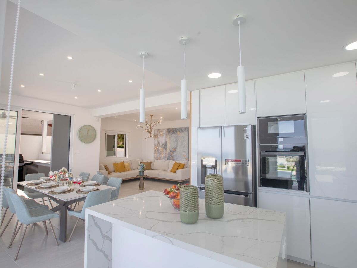 As you enter the villa, you will find the modern open-plan living room, kitchen and dining area, with large patio doors leading to the garden and pool area, and offering amazing sea views.