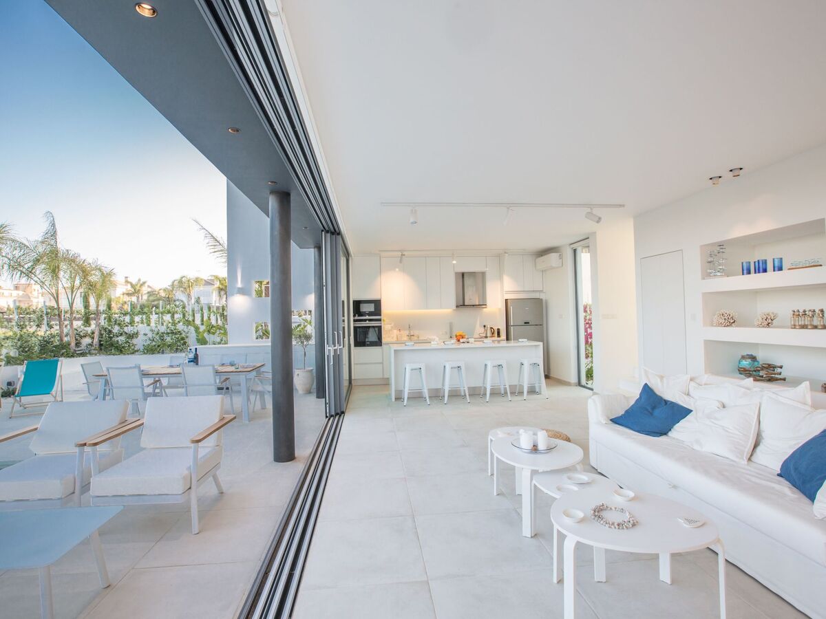 As you walk in to the villa, you will find the open-plan living room, kitchen and dining area.